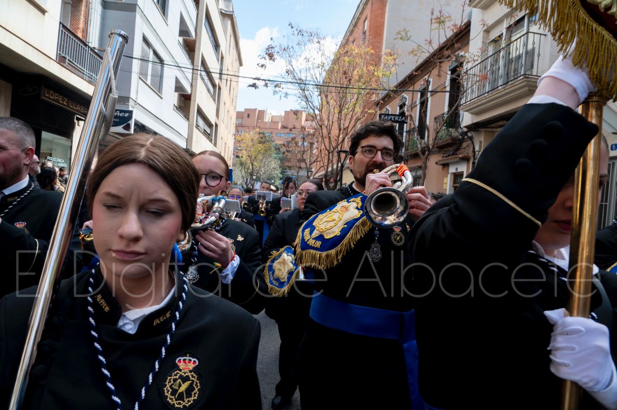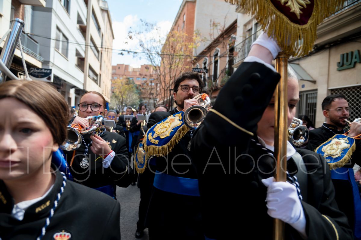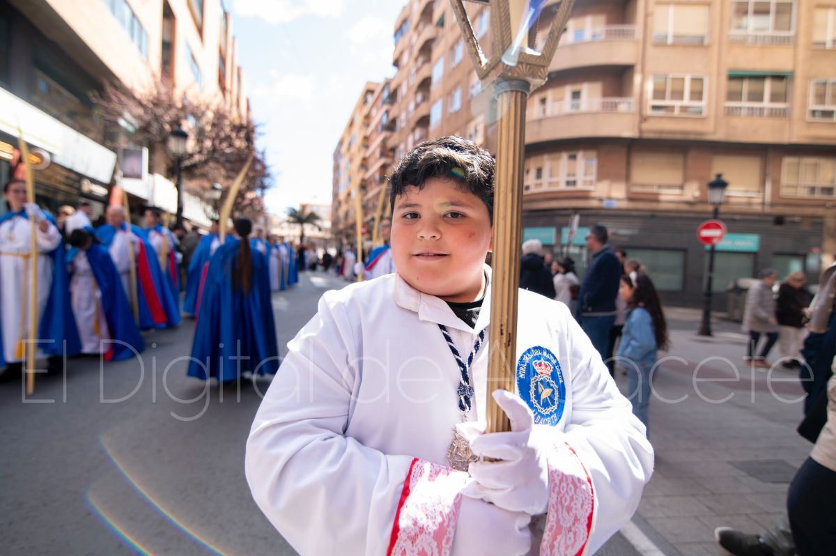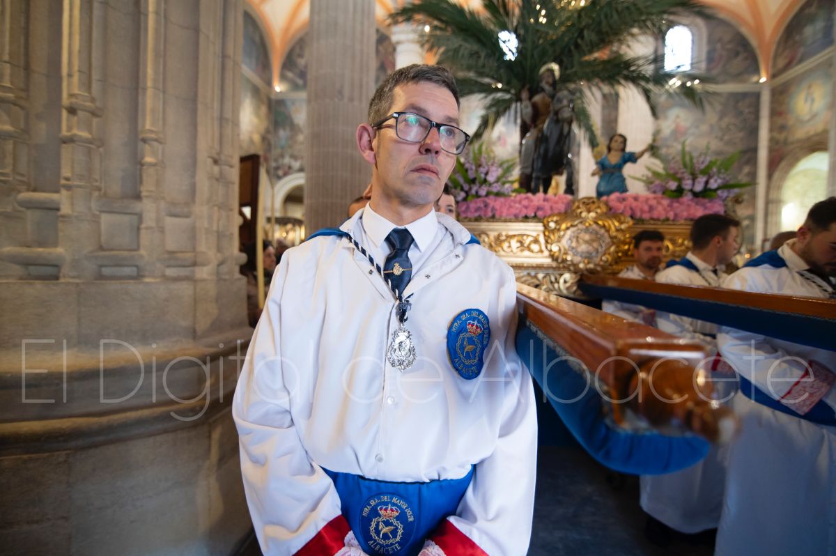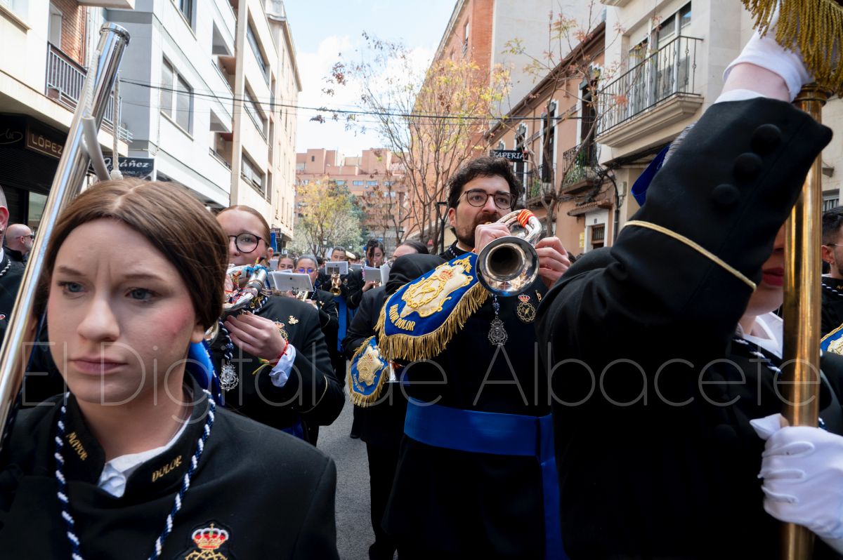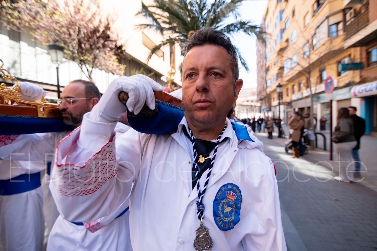 Tras la tradicional bendición de las palmas y ramas de olivo, la imagen de ‘La Borriquita’ salía de la Catedral de Albacete. Así, acompañaban a esta popular imagen en su discurrir por las calles de Albacete nazarenos la Cofradía de Nuestra Señora del Mayor Dolor que prescindían de los tradiciones capuces y mostraban su rostro en esta jornada dominical, conmemorando la entrada de Jesús en Jerusalén.