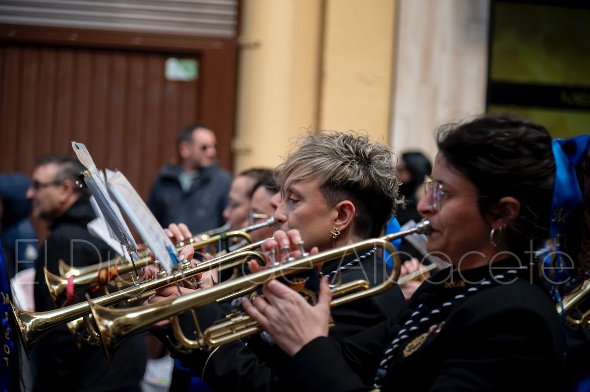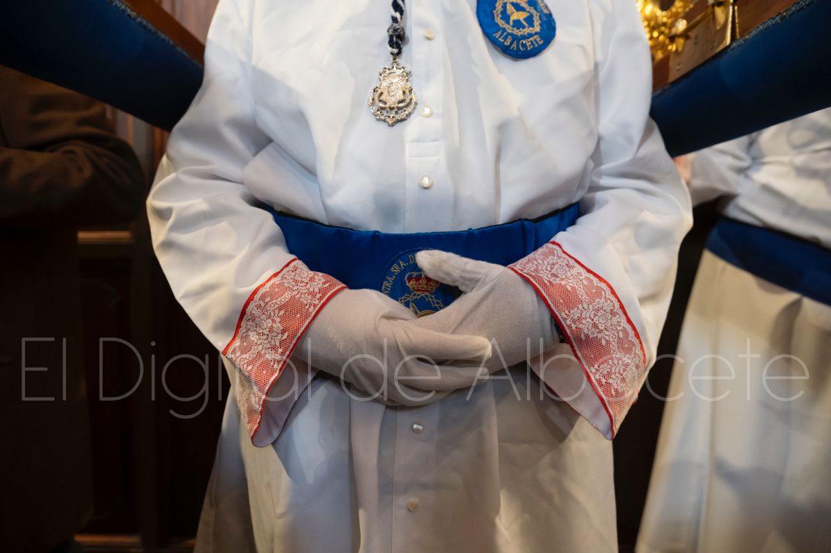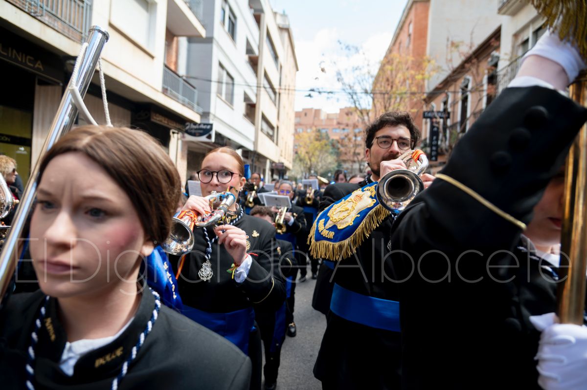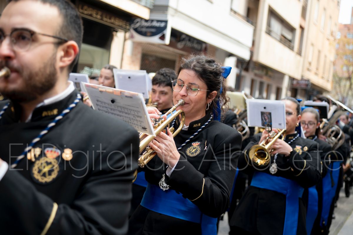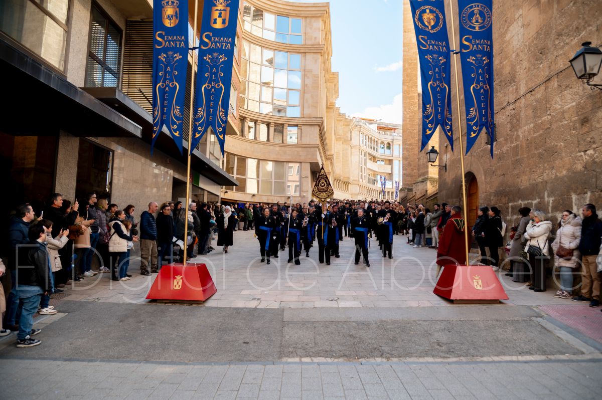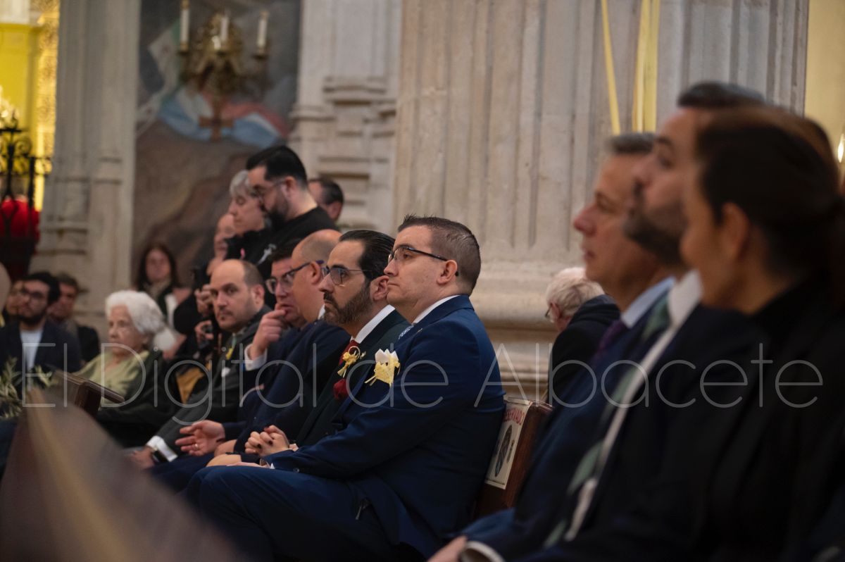 Tras la tradicional bendición de las palmas y ramas de olivo, la imagen de ‘La Borriquita’ salía de la Catedral de Albacete. Así, acompañaban a esta popular imagen en su discurrir por las calles de Albacete nazarenos la Cofradía de Nuestra Señora del Mayor Dolor que prescindían de los tradiciones capuces y mostraban su rostro en esta jornada dominical, conmemorando la entrada de Jesús en Jerusalén.