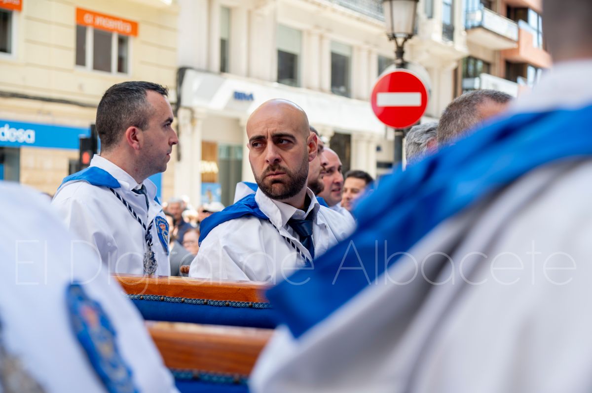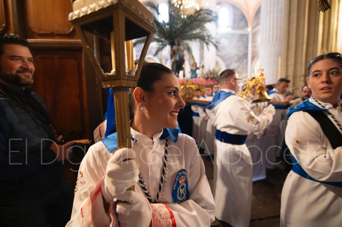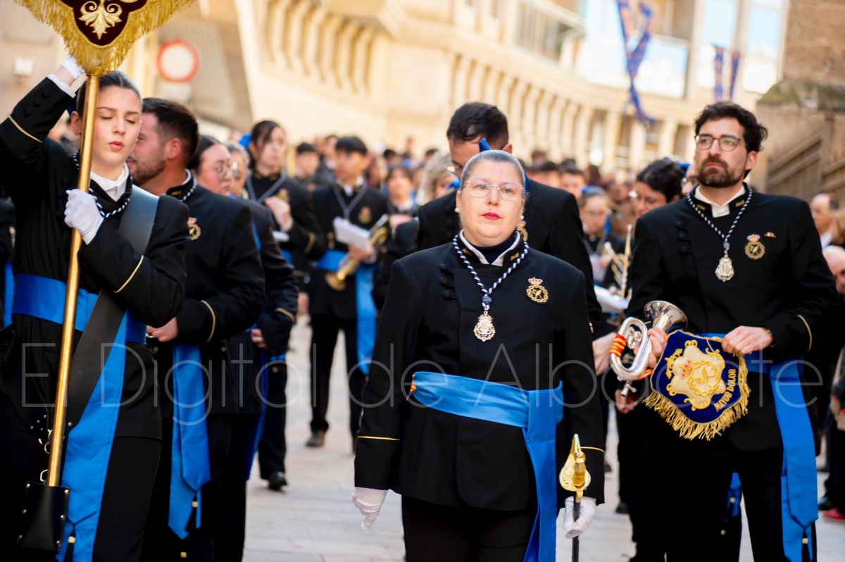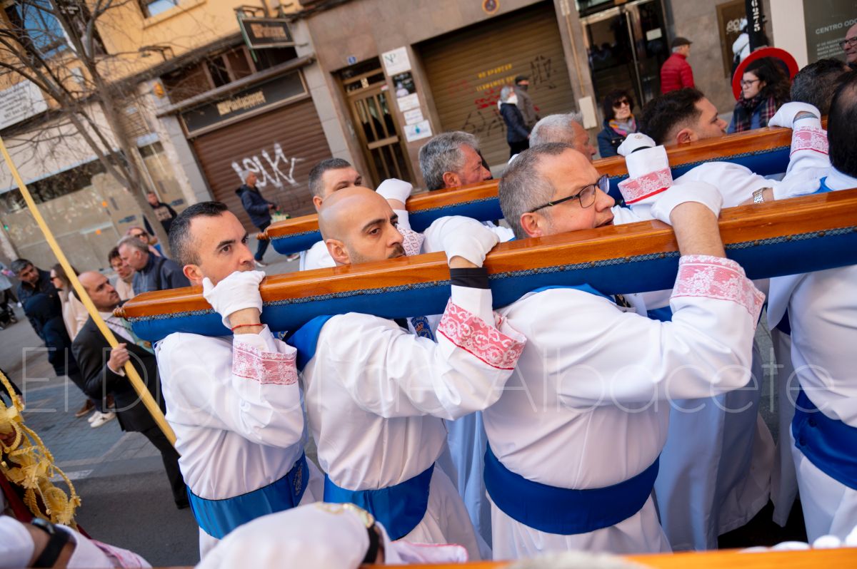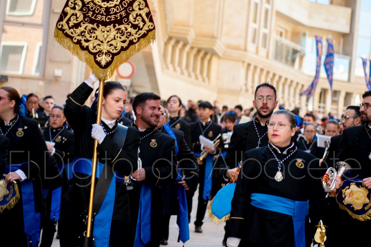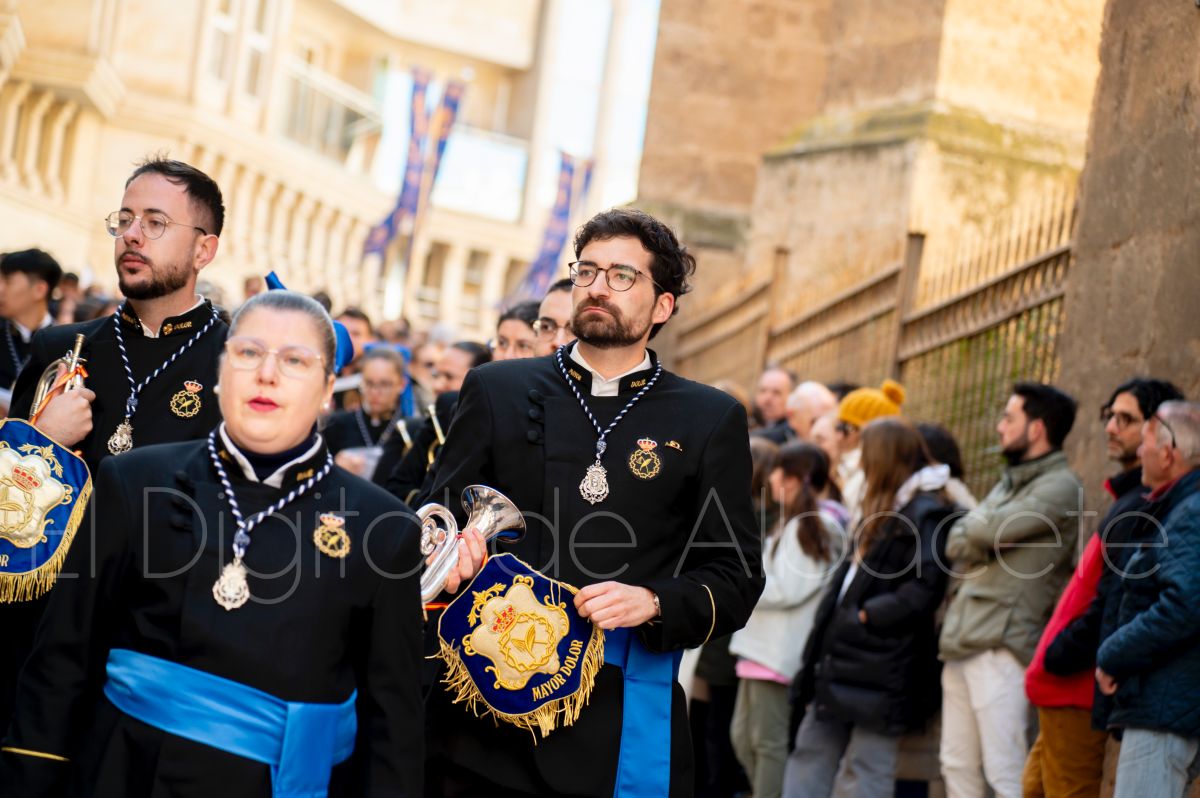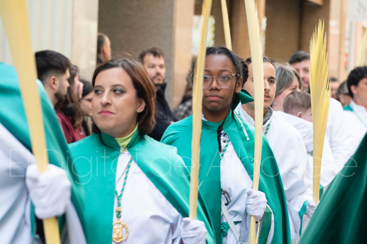 Tras la tradicional bendición de las palmas y ramas de olivo, la imagen de ‘La Borriquita’ salía de la Catedral de Albacete. Así, acompañaban a esta popular imagen en su discurrir por las calles de Albacete nazarenos la Cofradía de Nuestra Señora del Mayor Dolor que prescindían de los tradiciones capuces y mostraban su rostro en esta jornada dominical, conmemorando la entrada de Jesús en Jerusalén.