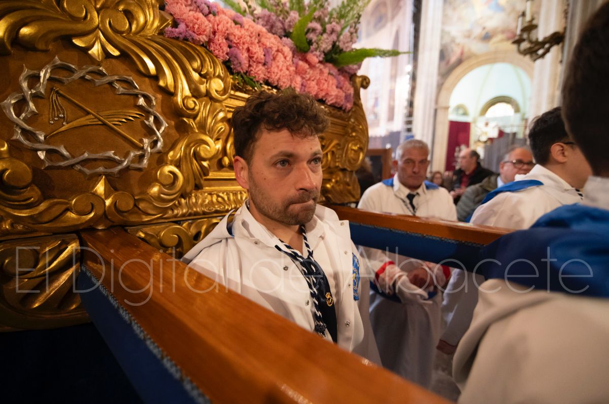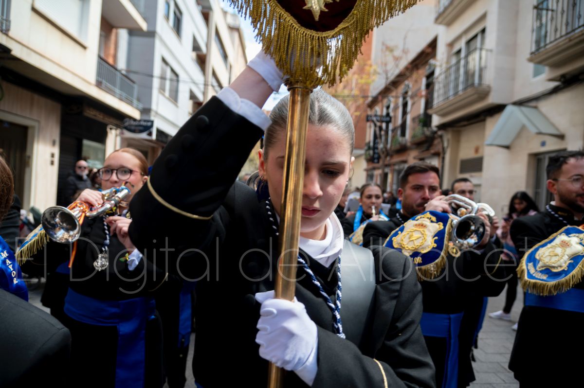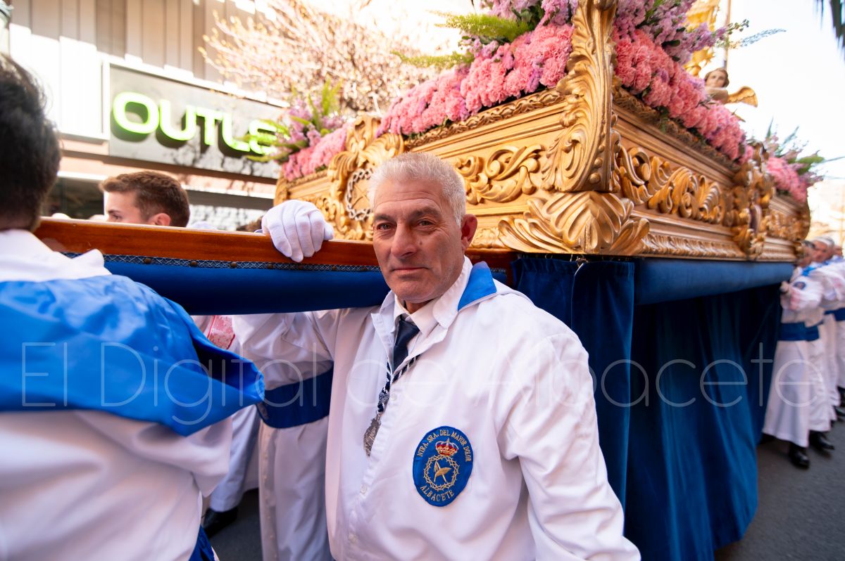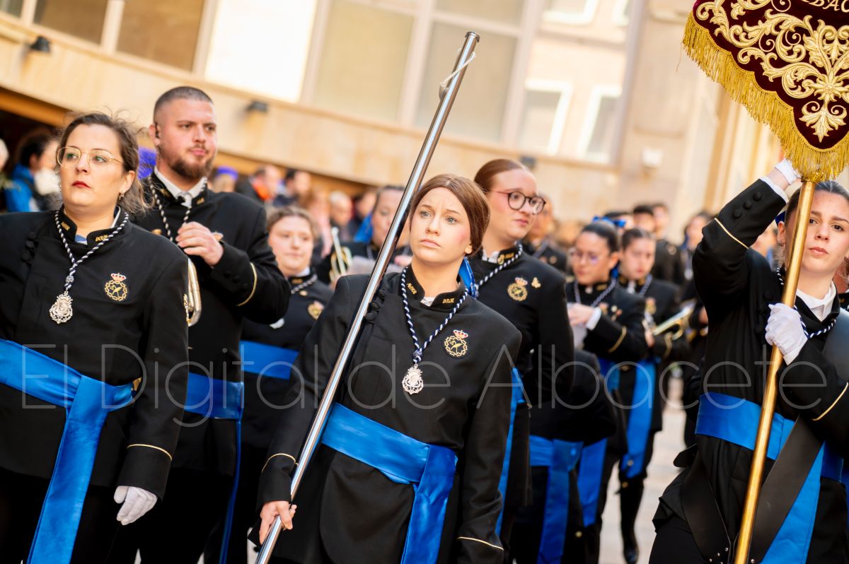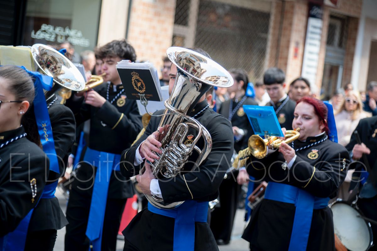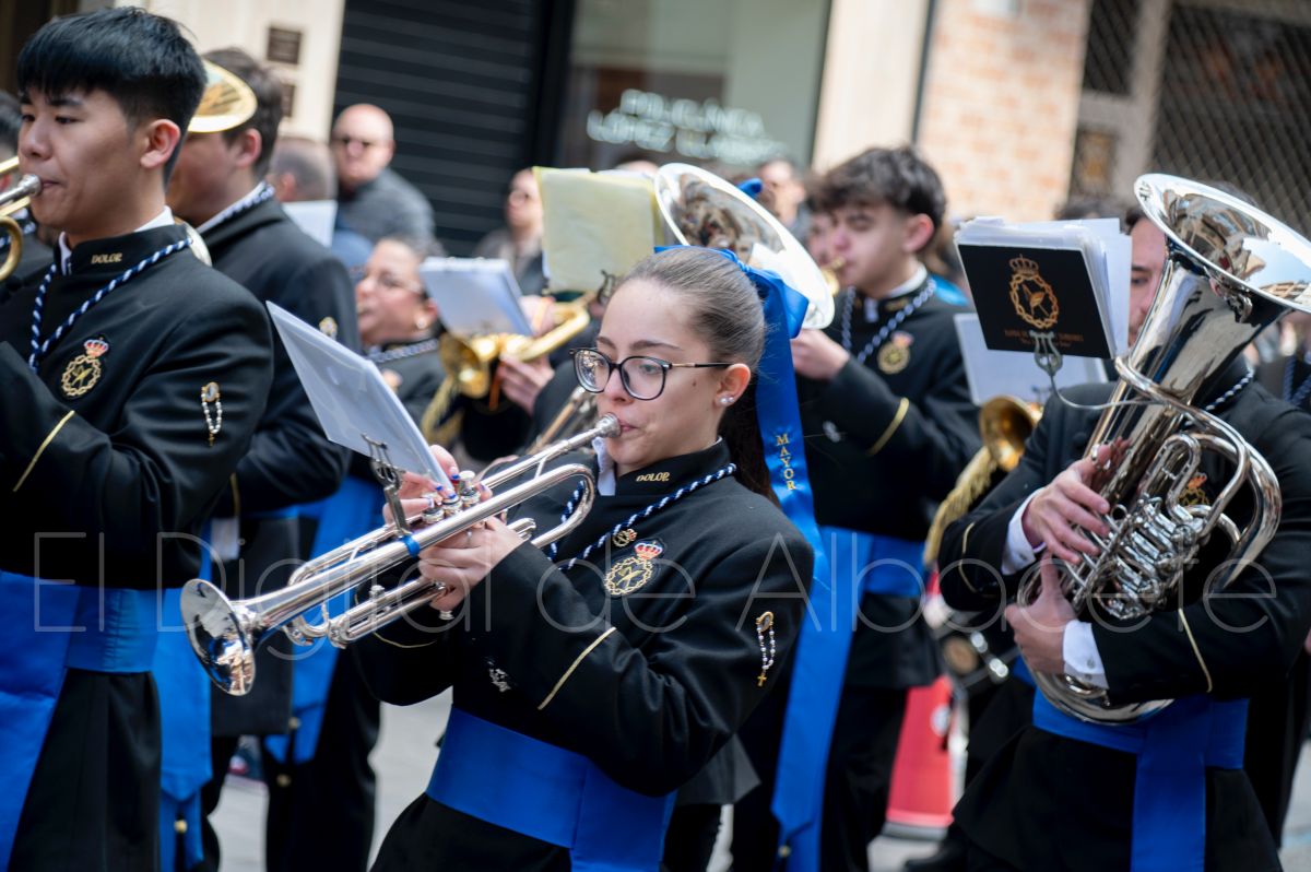 Tras la tradicional bendición de las palmas y ramas de olivo, la imagen de ‘La Borriquita’ salía de la Catedral de Albacete. Así, acompañaban a esta popular imagen en su discurrir por las calles de Albacete nazarenos la Cofradía de Nuestra Señora del Mayor Dolor que prescindían de los tradiciones capuces y mostraban su rostro en esta jornada dominical, conmemorando la entrada de Jesús en Jerusalén.