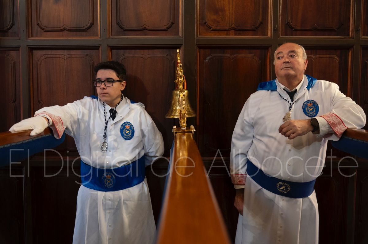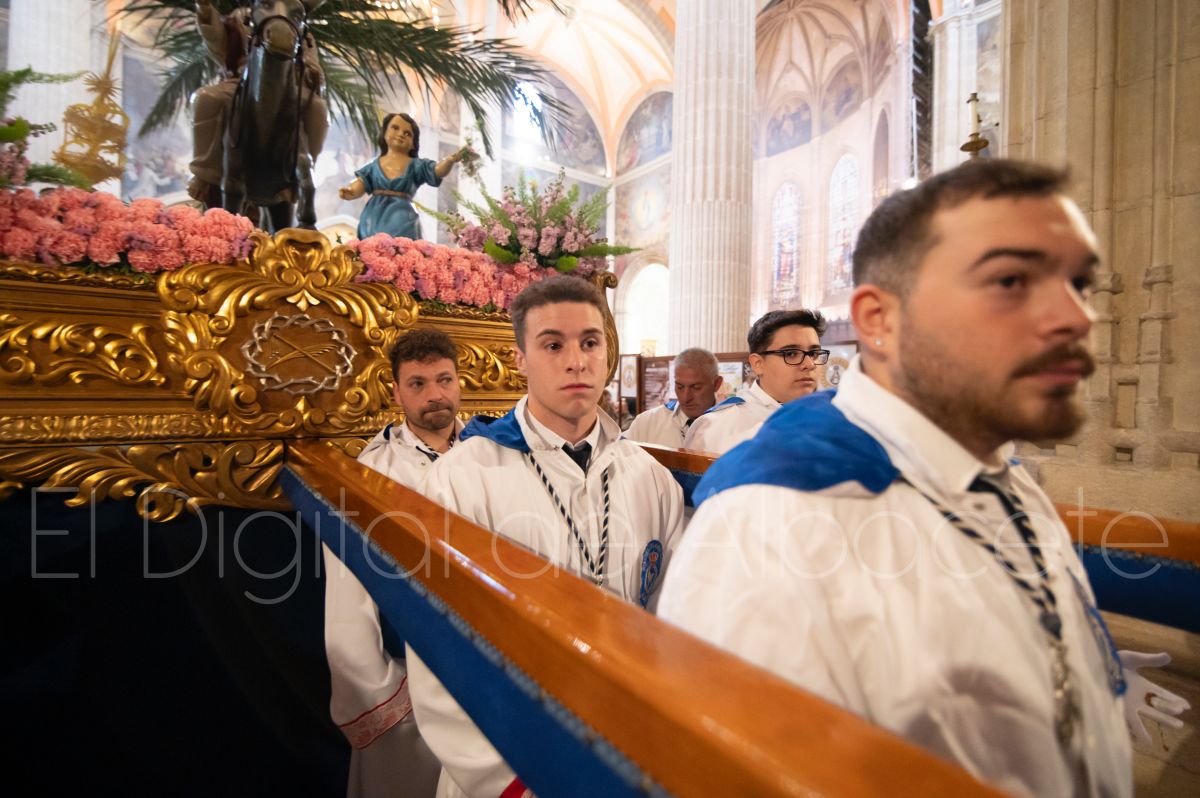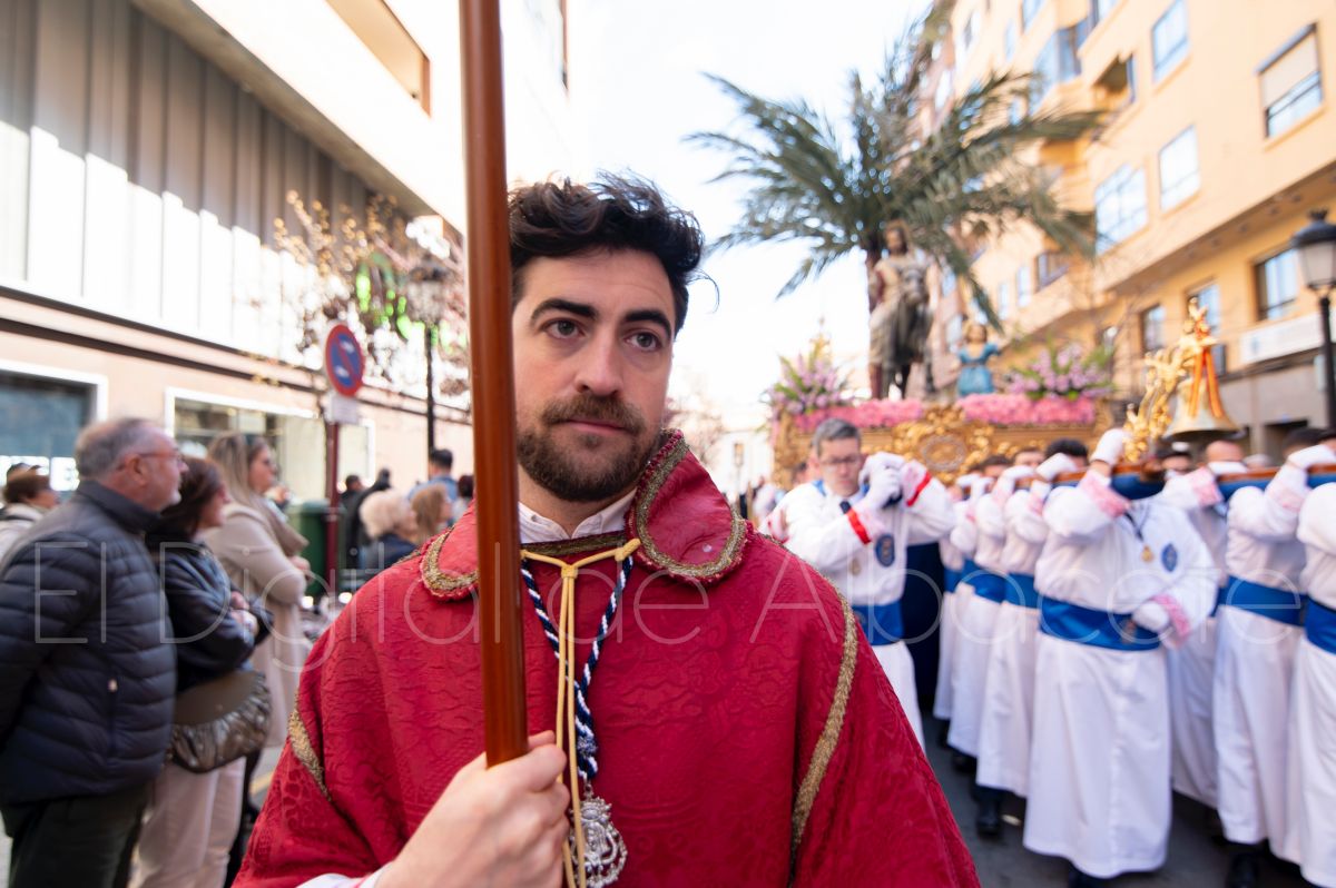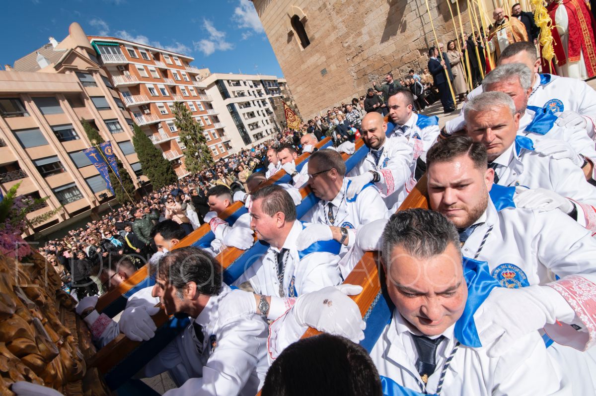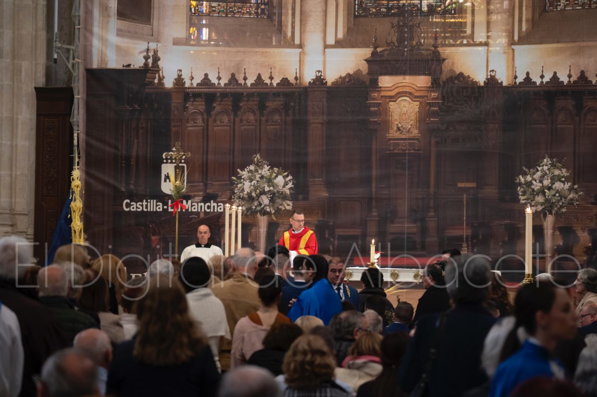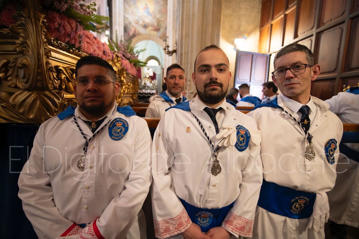 Tras la tradicional bendición de las palmas y ramas de olivo, la imagen de ‘La Borriquita’ salía de la Catedral de Albacete. Así, acompañaban a esta popular imagen en su discurrir por las calles de Albacete nazarenos la Cofradía de Nuestra Señora del Mayor Dolor que prescindían de los tradiciones capuces y mostraban su rostro en esta jornada dominical, conmemorando la entrada de Jesús en Jerusalén.