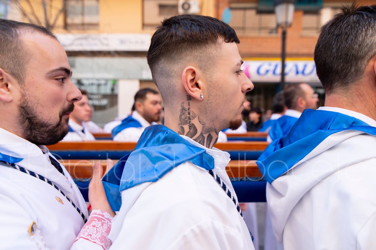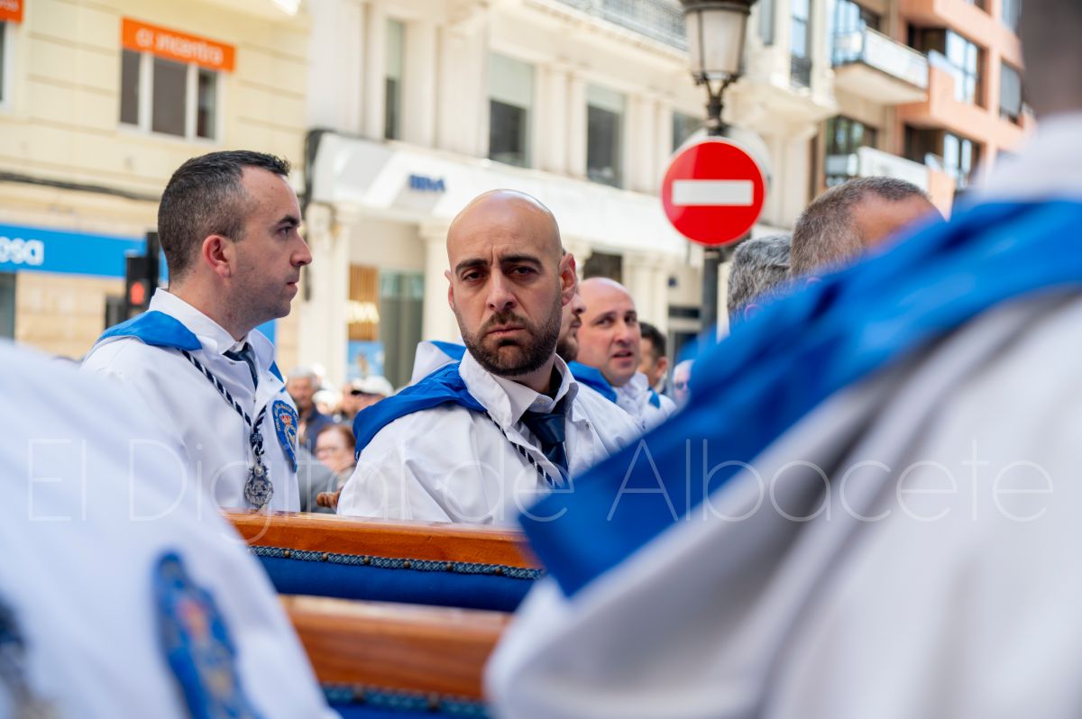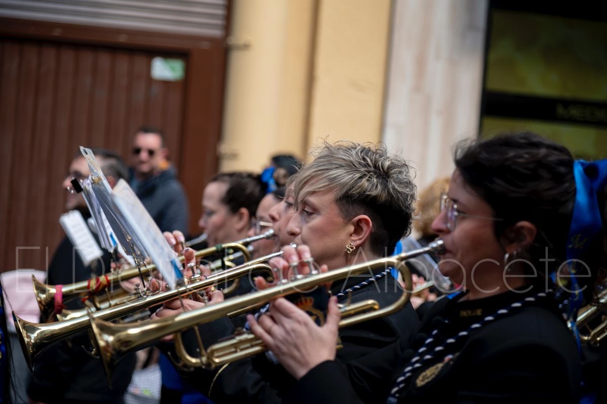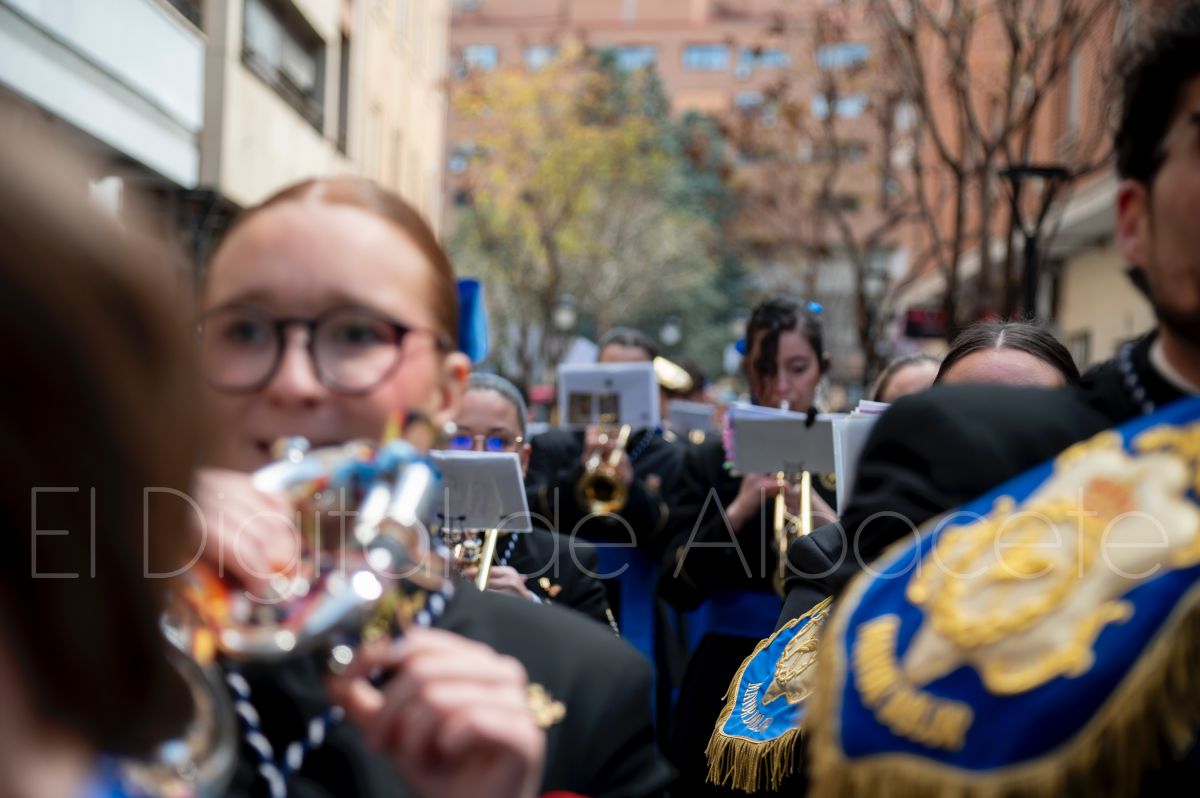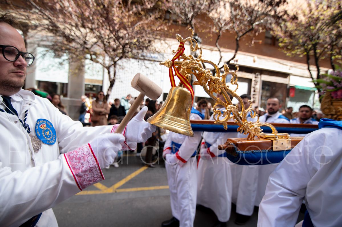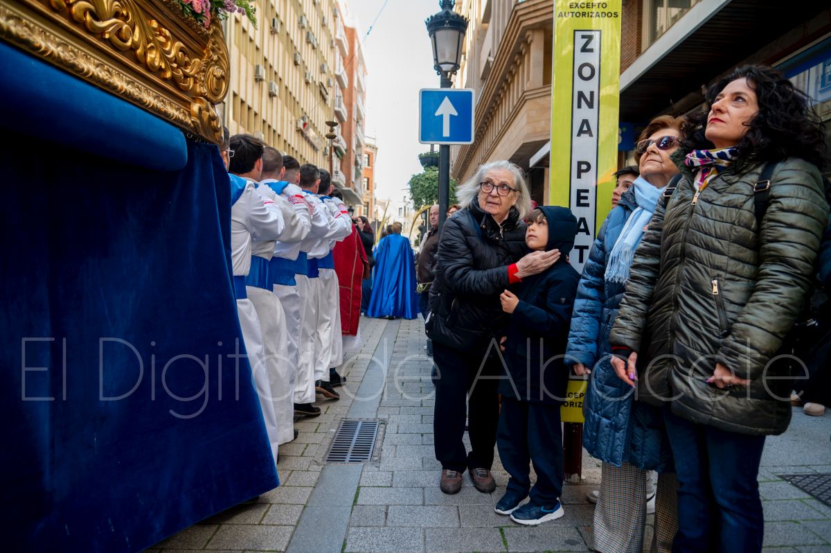 Tras la tradicional bendición de las palmas en la Catedral de Albacete, ‘La Borriquita’ iniciaba su recorrido acompañada por la Cofradía de Nuestra Señora del Mayor Dolor y una nutrida representación de nazarenos de otras cofradías de la Semana Santa albaceteña. Precisamente en esta ocasión, los nazarenos prescindieron del habitual capuz, mostrando sus rostros, en consonancia con el carácter festivo de esta celebración. Un gesto que simboliza la apertura y la alegría propias del Domingo de Ramos.