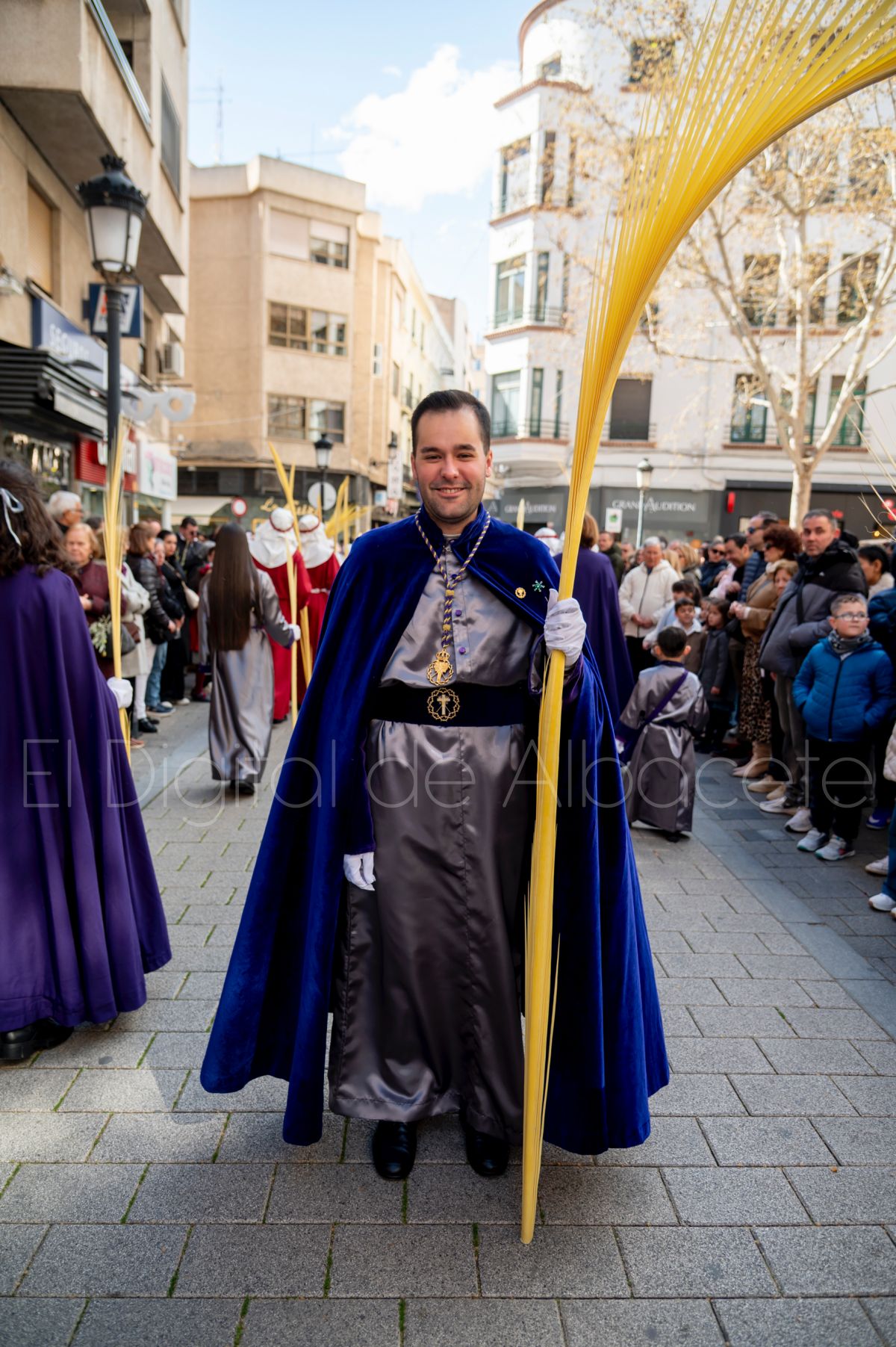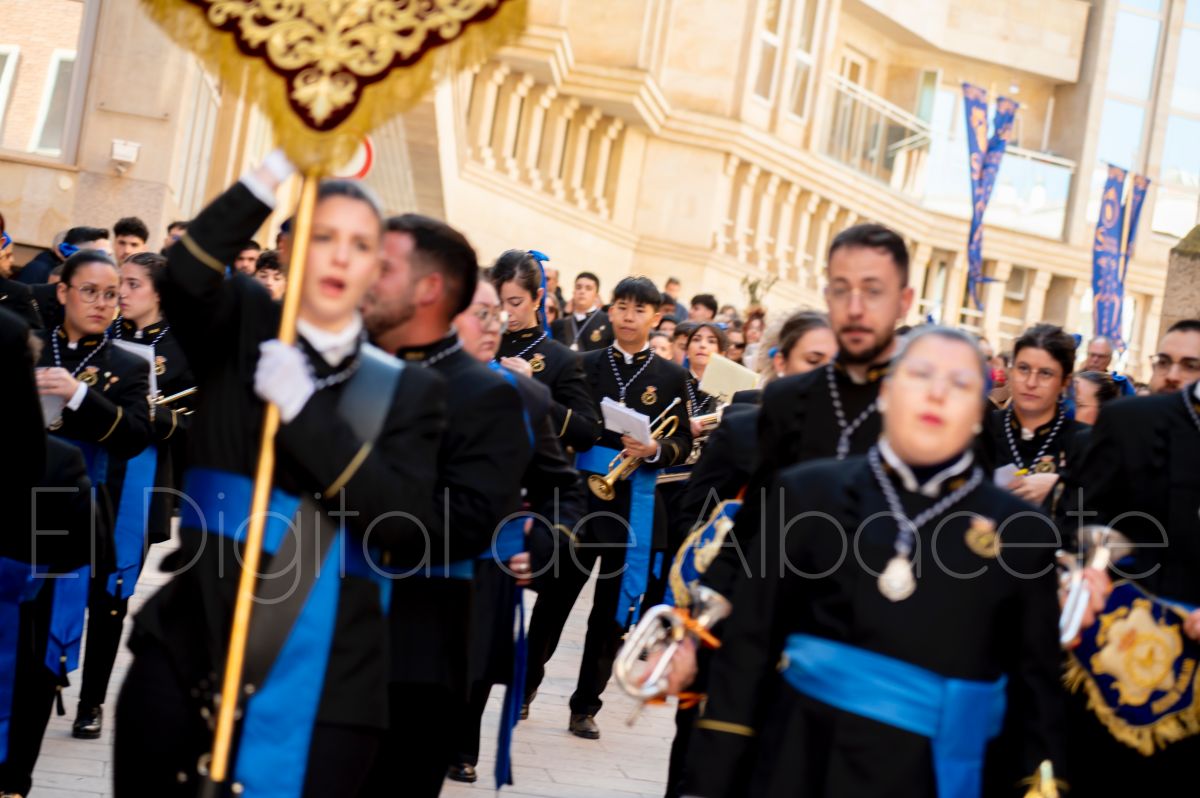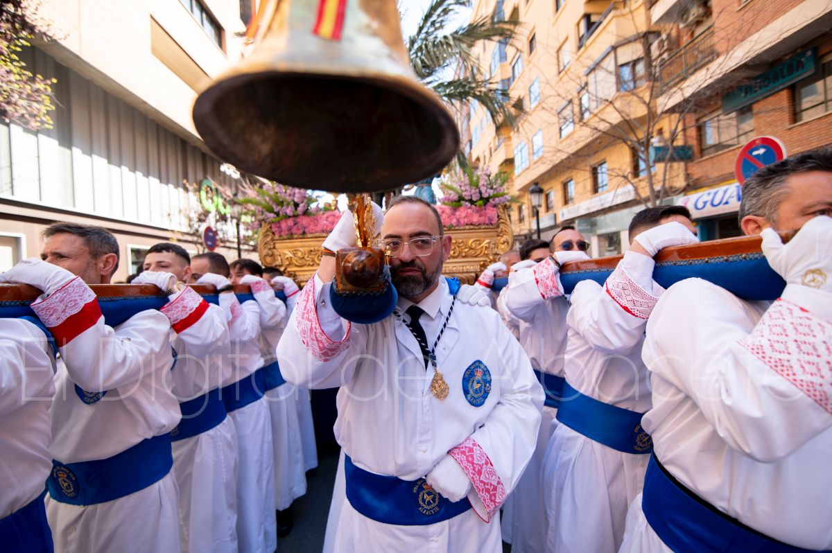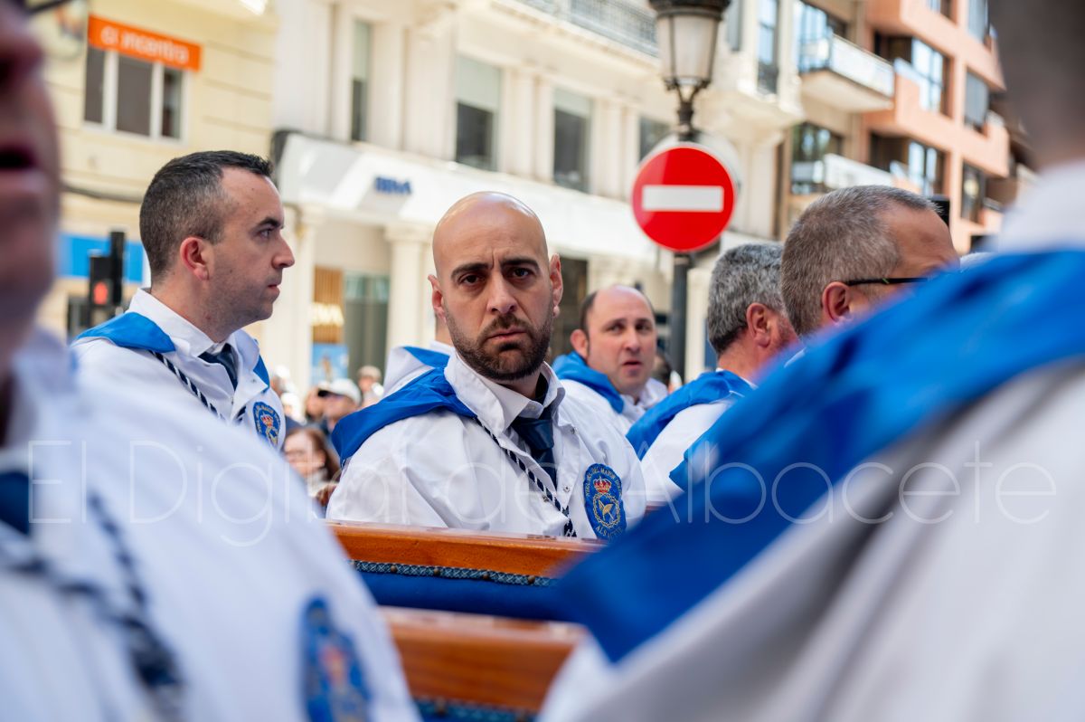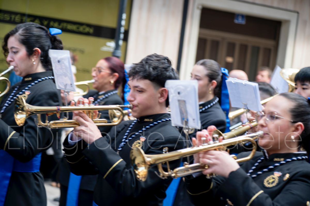 Tras la tradicional bendición de las palmas en la Catedral de Albacete, ‘La Borriquita’ iniciaba su recorrido acompañada por la Cofradía de Nuestra Señora del Mayor Dolor y una nutrida representación de nazarenos de otras cofradías de la Semana Santa albaceteña. Precisamente en esta ocasión, los nazarenos prescindieron del habitual capuz, mostrando sus rostros, en consonancia con el carácter festivo de esta celebración. Un gesto que simboliza la apertura y la alegría propias del Domingo de Ramos.