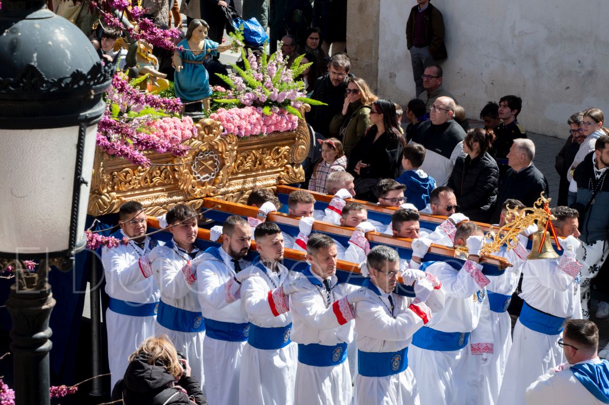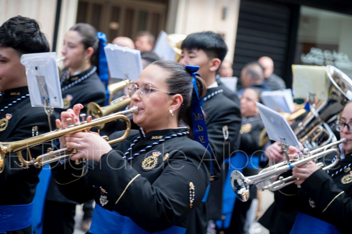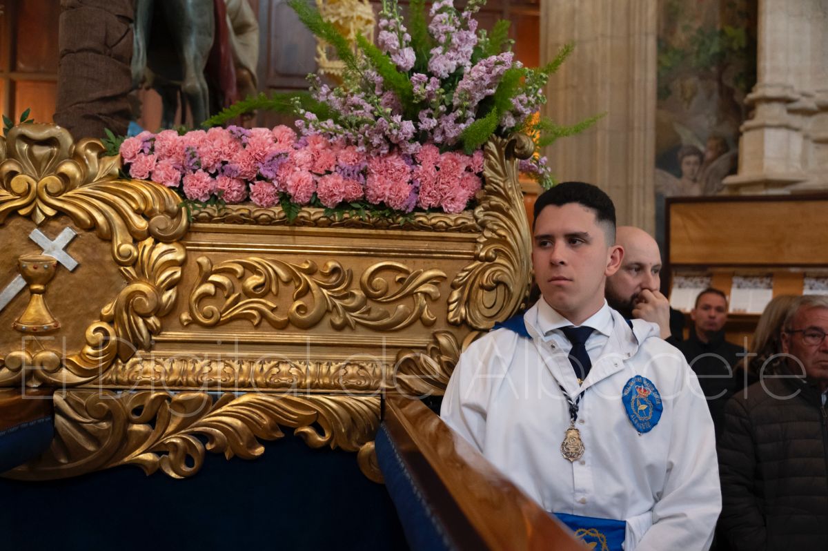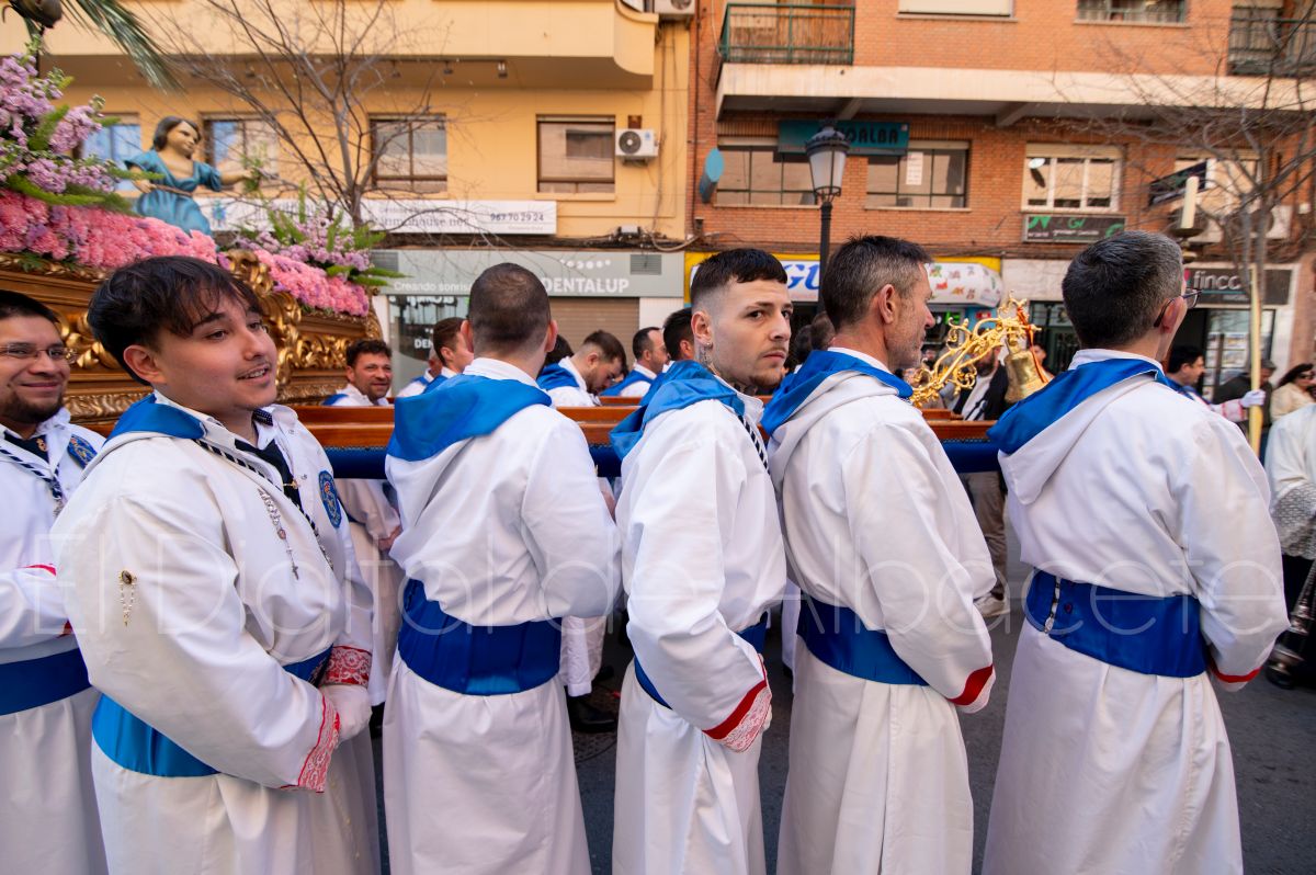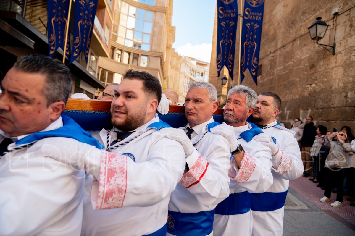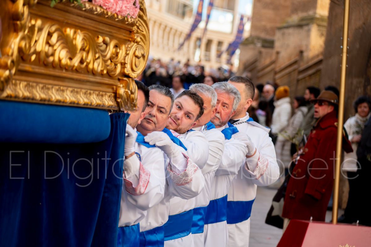 Tras la tradicional bendición de las palmas en la Catedral de Albacete, ‘La Borriquita’ iniciaba su recorrido acompañada por la Cofradía de Nuestra Señora del Mayor Dolor y una nutrida representación de nazarenos de otras cofradías de la Semana Santa albaceteña. Precisamente en esta ocasión, los nazarenos prescindieron del habitual capuz, mostrando sus rostros, en consonancia con el carácter festivo de esta celebración. Un gesto que simboliza la apertura y la alegría propias del Domingo de Ramos.