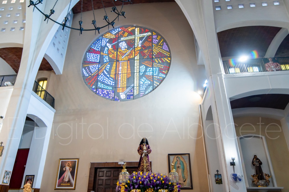 Se trata de una imponente obra de gran dramatismo, realizada en 1952 por el artista Antonio Morante. La imagen destaca por sus marcados rasgos y su notable realismo, con detalles tan singulares como el cabello natural donado por devotos o la característica túnica morada que la distingue, elementos que convierten al Cristo de Medinaceli en una talla única en la ciudad de Albacete.