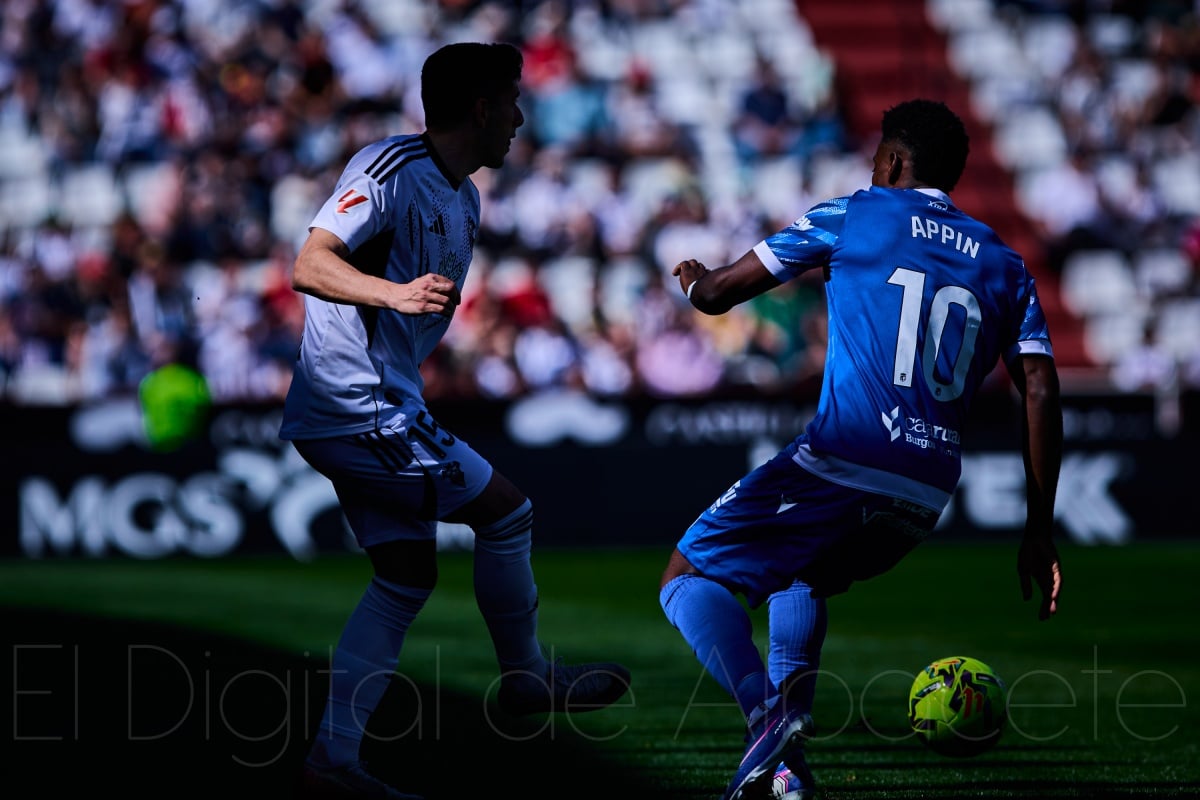 Llegados al minuto 13 y hablando de errores, Carlos Neva, primero, y Javi Moreno, después, cometieron sendos fallos pueriles y propiciaron que Curro y Appin montaran el taco y el 0-1 subiera al marcador por parte de un Burgos CF que mandó a dormir la primera que tuvo y que se adelantó con suma facilidad en el Carlos Belmonte tras ponérselo Neva y Moreno en bandeja de plata. Comenzó la jugada en el perfil diestro del ataque burgalesista, donde Neva fue un cono para Curro, pues el ’16’ del Burgos se fue del ex del Granada con la misma facilidad que usted se ha comido una torrija esta Semana Santa, conectando con un Appin al que Javi Moreno le dio incomprensiblemente unos metros de margen para correr, marchándose el francés del asturiano como cuando el Correcaminos dejaba atrás al Coyote, siendo tan solo el zaguero del Albacete capaz de verle la matrícula trasera al ’10’ del Burgos, que una vez solo ante Lizoain cruzó el esférico al palo largo e hizo el 0-1.