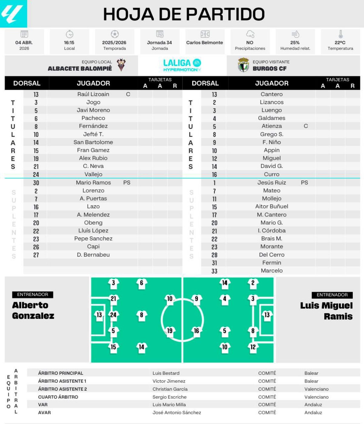 Así las cosas y a la caída del once de Pepe Sánchez, hay que añadir las de Lorenzo Aguado, Dani Bernabéu, Capi, Obeng y Ale Meléndez, siendo Javi Moreno, Fran Gámez, JoGo, Martín Fernández, San Bartolomé y Jefté sus sustitutos. Raúl Lizoain, Jesús Vallejo, Carlos Neva, Antonio Pachecho y Alex Rubio, completaron el once inicial del Albacete Balompié ante un Burgos CF que llegaba al Carlos Belmonte rozando las posiciones de Play Off y con sus opciones de poder disputarlos al final de temporada intactas.