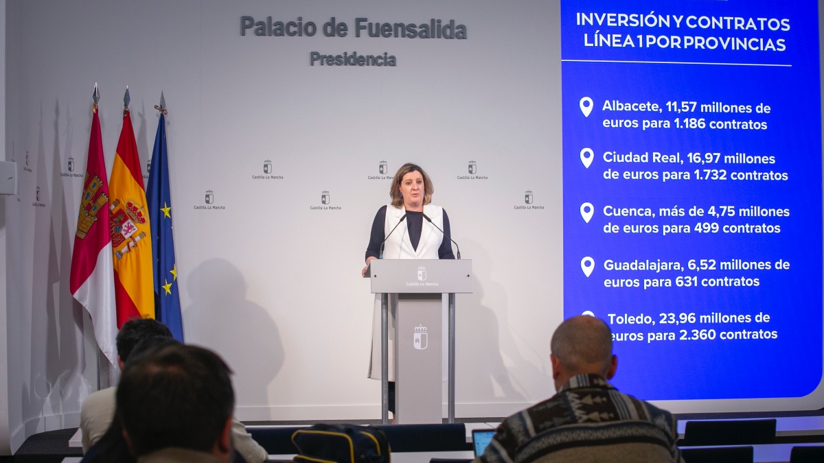 La consejera ha recordado que, en el reparto provincial de la convocatoria, el detalle es el siguiente: en Albacete, una inversión conjunta de 11,57 millones de euros para 1.186 contratos, aportando más de 7 millones de euros la Junta y 4,53 millones la Diputación; en Ciudad Real, 16,97 millones de euros para 1.732 contrataciones, aportando 10,32 millones de euros la Junta y 6,65 millones la Diputación; en Cuenca, más de 4,75 millones de euros para 499 contratos, aportando 2,89 millones la Junta y 1,86 millones la Diputación; en Guadalajara, 6,52 millones de euros para impulsar 631 contratos, con casi 4 millones de euros de la Junta y 2,55 millones de la Diputación; y en Toledo, 23,96 millones de euros para apoyar 2.360 contrataciones, con 14,56 millones de euros de la Junta y 9,39 millones de la Diputación.