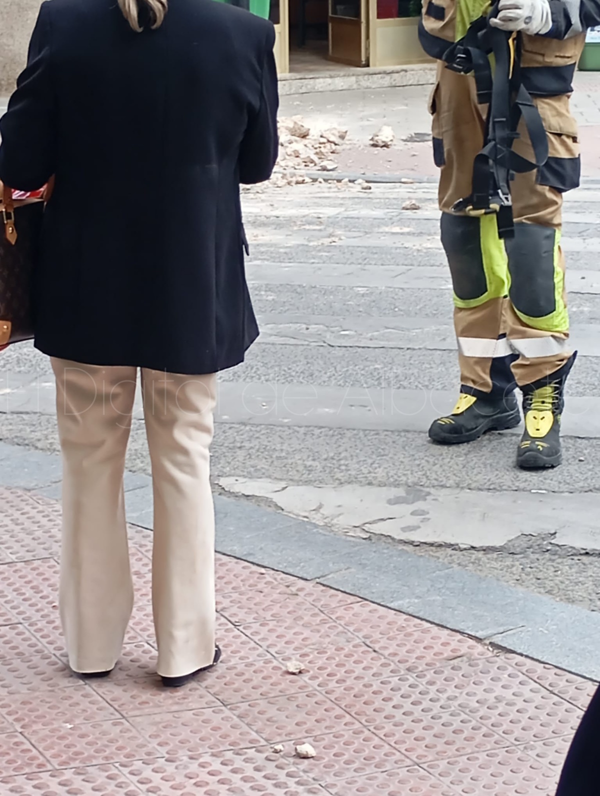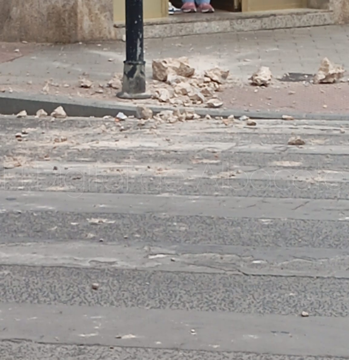 Como consecuencia del desprendimiento, varios cascotes de gran tamaño se han precipitado a la calle. La caída de estos fragmentos ha generado una lógica alarma, ya que se trata de un punto de paso habitual para numerosos peatones a esa hora de la tarde.