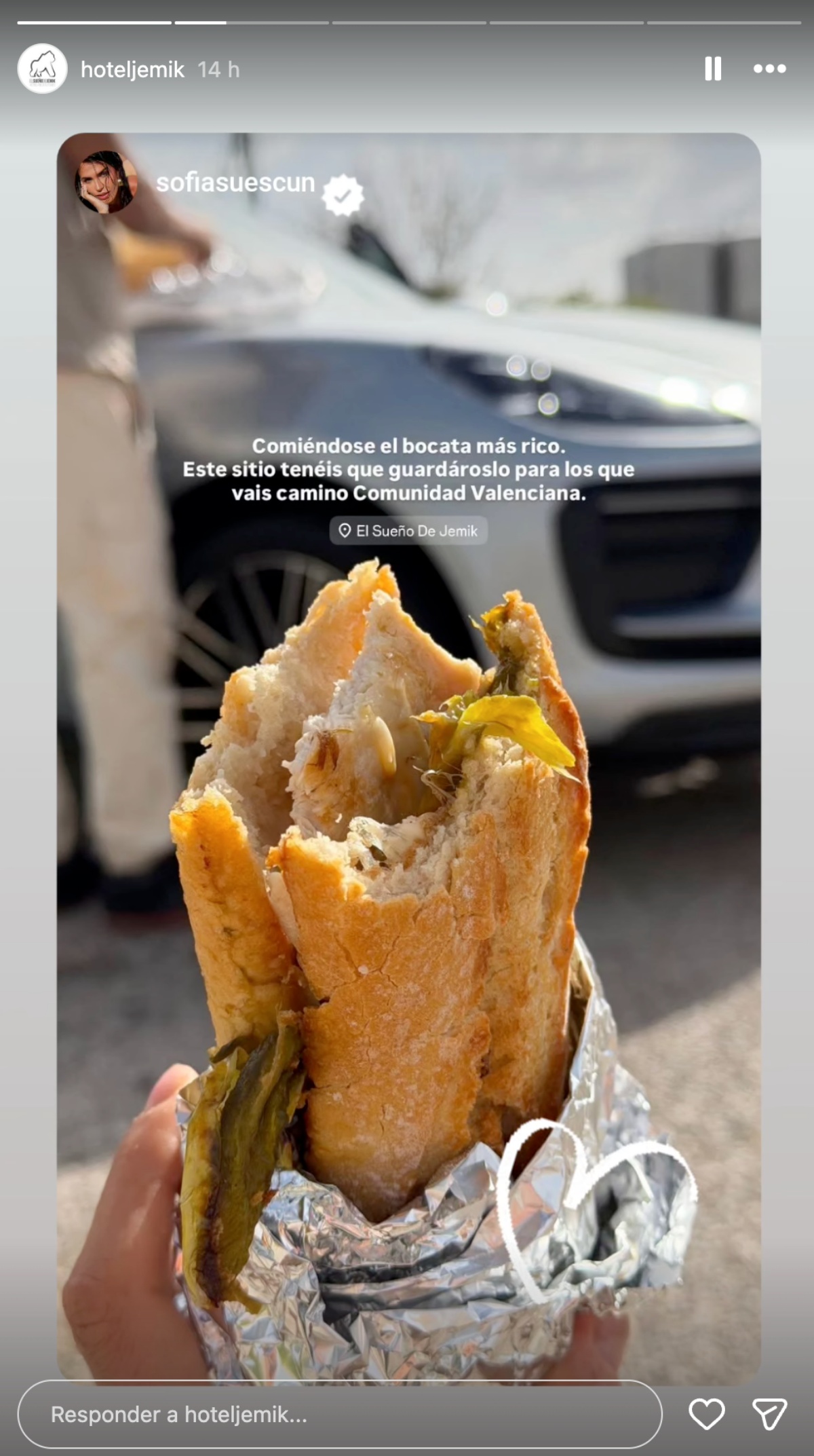 Pero si algo ha llamado especialmente la atención ha sido su elección gastronómica. La pareja ha degustado uno de los bocadillos más populares del local, el clásico serranito -con lomo, jamón y pimientos-, que Sofía no ha dudado en recomendar: «Comiéndose el bocata más rico. Este sitio tenéis que guardároslo para los que vais de camino a la Comunidad Valenciana».