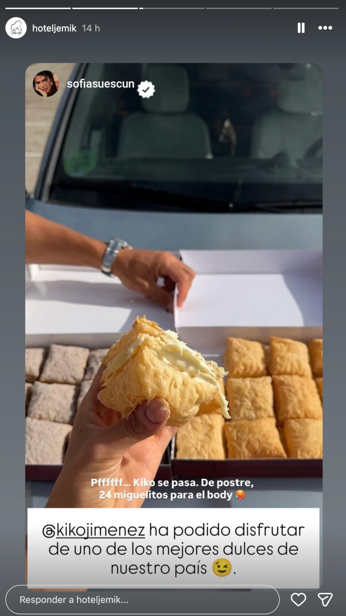 El toque dulce ha llegado con uno de los productos más emblemáticos de la zona: los Miguelitos de La Roda. La influencer ha sorprendido mostrando dos cajas del famoso dulce, en versiones de chocolate y chocolate blanco, acompañadas del comentario: «Pfff… Kiko se pasa. De postre, 24 Miguelitos para el body».