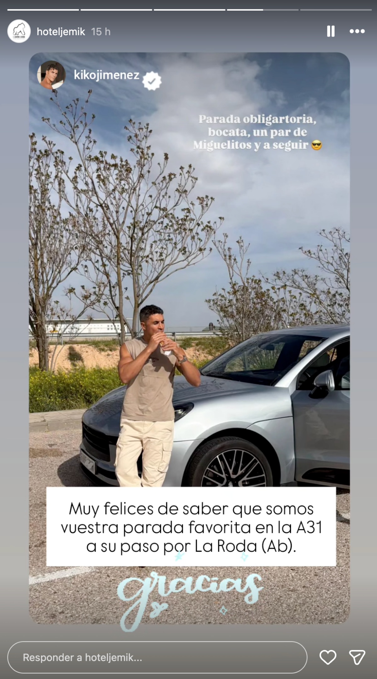 El propio restaurante no ha tardado en hacerse eco de la visita, republicando las stories en sus redes sociales y agradeciendo el gesto: «Gracias por confiar en nosotros en cada uno de vuestros viajes. Muy felices de saber que somos vuestra parada favorita en la A-31 a su paso por La Roda (Albacete)».