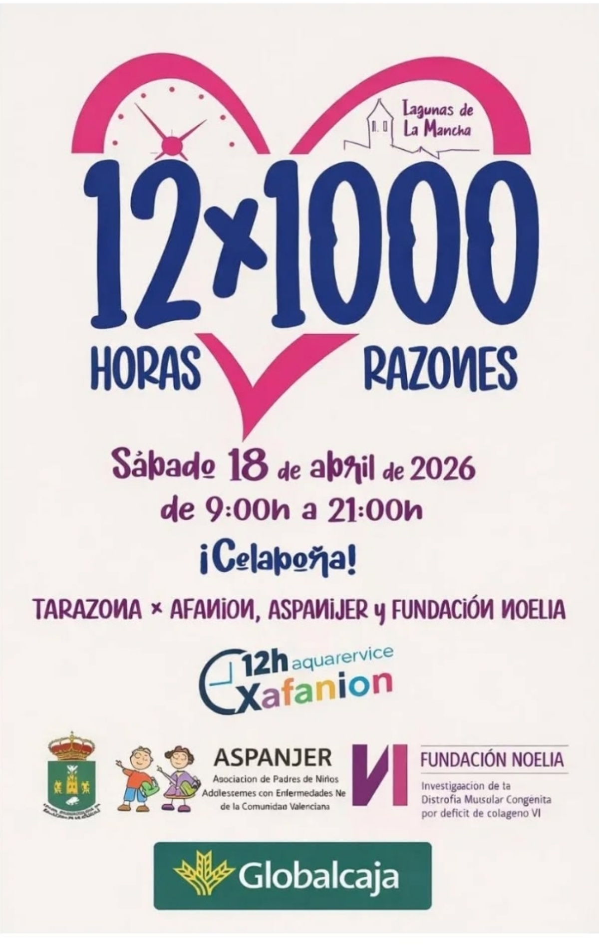 Los vecinos de Tarazona de La Mancha (Albacete) tienen una cita solidaria este 18 de abril. ’12 horas, mil razones’ viaja en esta ocasión hasta este municipio de Albacete, que tiene como objetivo recaudar fondos para la investigación no solo para AFANION, sino también para Fundación Noelia y ASPANJER, dedicadas a enfermedades raras.