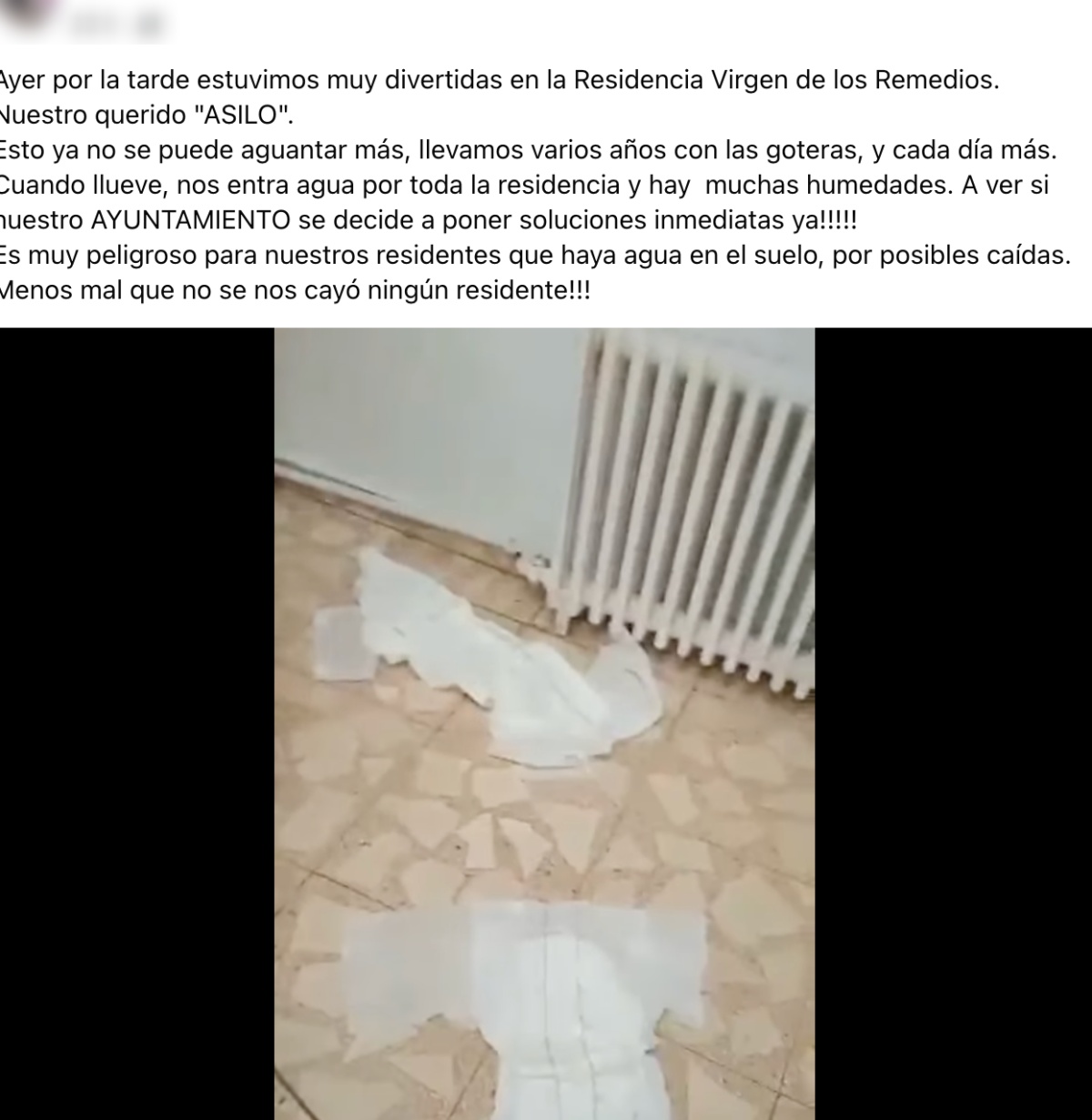 Según aseguran en redes sociales, “llevamos años con problemas por las goteras”. Una situación que, según indican, cada día va a más. En el vídeo se puede observar cómo a causa del agua que entra en la residencia han intentado paliar la situación con mantas y pañales por el suelo para tratar de contener esta problemática.