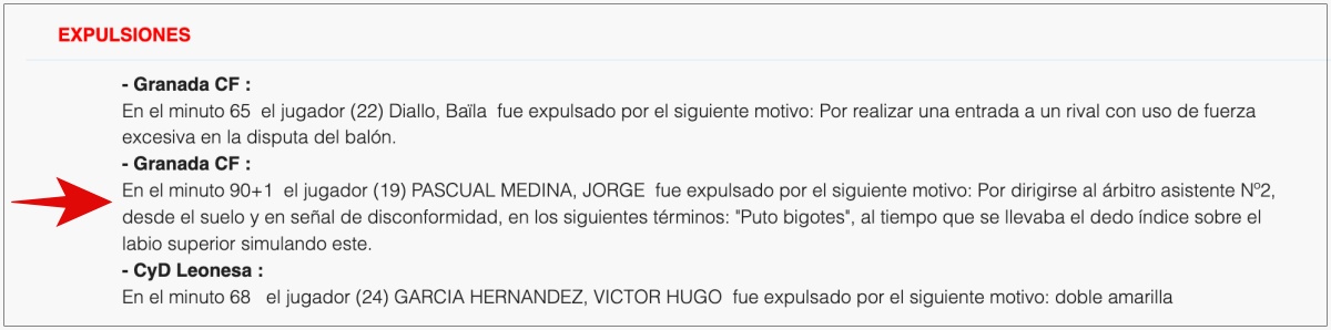 En la misma redacción arbitral también se hizo constar que el futbolista acompañó sus palabras con un gesto explícito: se llevó el dedo índice a la parte superior del labio, simulando un bigote. Esa conducta fue castigada en el acto con tarjeta roja directa y Pascual no estará en Albacete. A día de hoy, Jorge Pascual suma 8 goles y acumula 33 partidos disputados esta temporada de un total de 35, lo que deja muy a las claras lo sensible de la baja para el Granada al no poder contar con el jugador en Albacete.
