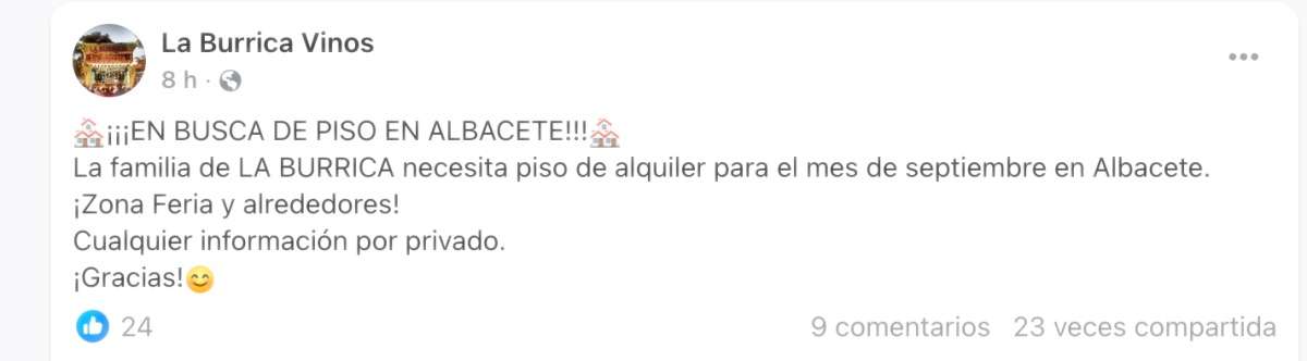 Tal y como han compartido en redes sociales, se encuentran en búsqueda de piso en Albacete de cara a septiembre. “La familia de ‘La Burrica’ necesita piso de alquiler para el mes de septiembre”, han explicado en redes sociales, y han añadido que, preferiblemente por la zona Feria y alrededores.