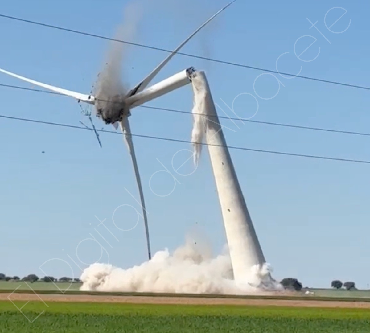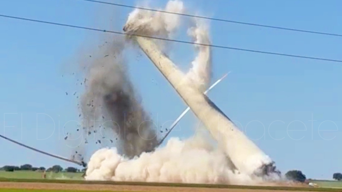 Así las cosas, la demolición controlada de un aerogenerador ha dejado este jueves una imagen poco habitual en la llanura manchega. La actuación, ejecutada mediante la colocación de explosivos en la base de la estructura, tuvo lugar en un paraje situado entre Barrax y La Roda, aunque dentro del término municipal rodense. Las imágenes captadas durante la operación muestran el momento en el que la torre cede desde su arranque, pierde la verticalidad y termina desplomándose de forma controlada sobre el terreno agrícola, sin incidentes.
