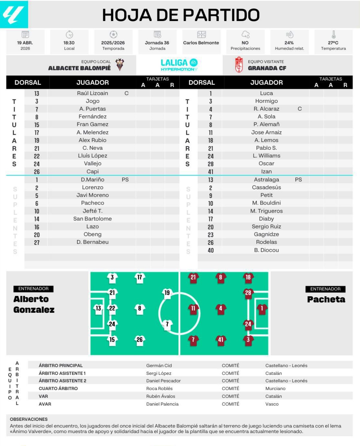 Enfrente, el Granada de Pacheta compareció con Luca Zidane bajo palos; Lemos, Óscar, Williams y Hormigo en defensa; Alemán, Alcaraz e Izan en la sala de máquinas; y Sola, Arnáiz y Pablo Sáenz —de héroe a villano para la parroquia albacetista tras su actitud en el mercado invernal— en ataque.