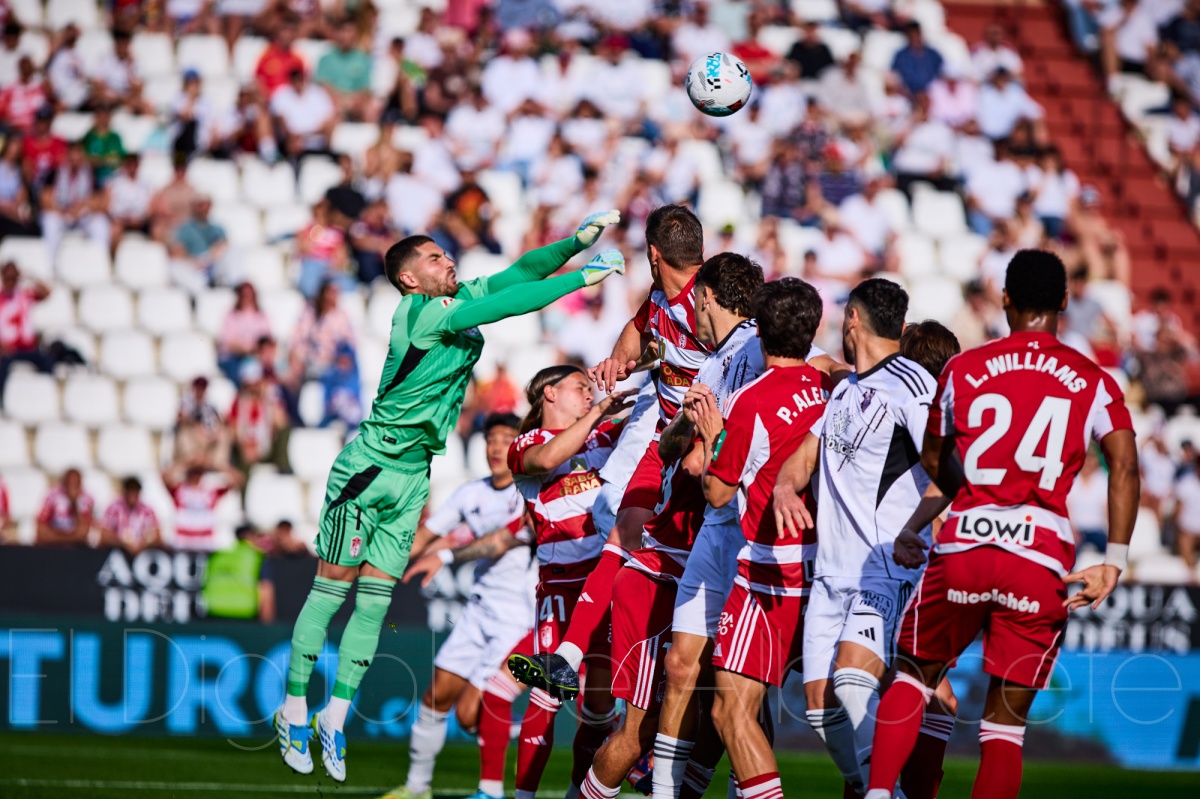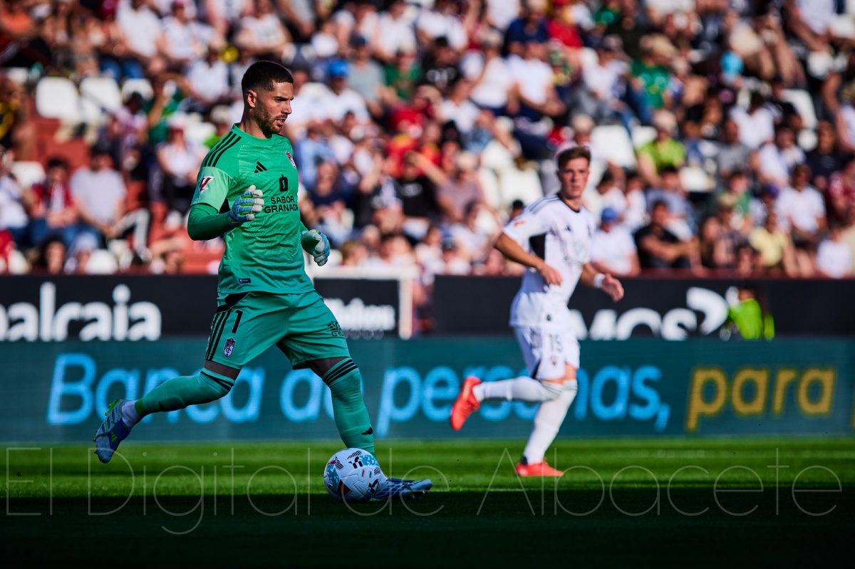 Y la realidad del arranque de la segunda mitad no hizo sino reforzar esa sensación. Exactamente igual que en el primer tiempo, el Granada comenzó bastante mejor que el Albacete. Más enchufado, mejor posicionado, con mayor criterio en la circulación y con una presencia mucho más firme en campo rival. El Alba, en cambio, volvió a salir blando, reactivo, sin saber cómo sujetar el partido y dando la impresión de que el terreno tenía pendiente hacia la portería de Raúl Lizoain. Y no fue solo una impresión: el guardameta del Albacete tuvo que volver a meter otra mano salvadora en los compases iniciales para evitar que el castillo empezara a resquebrajarse antes de tiempo.