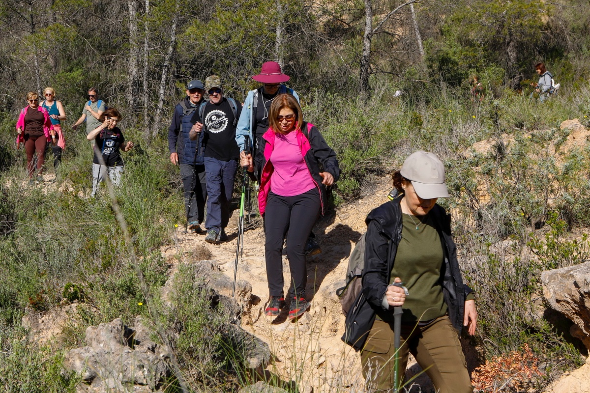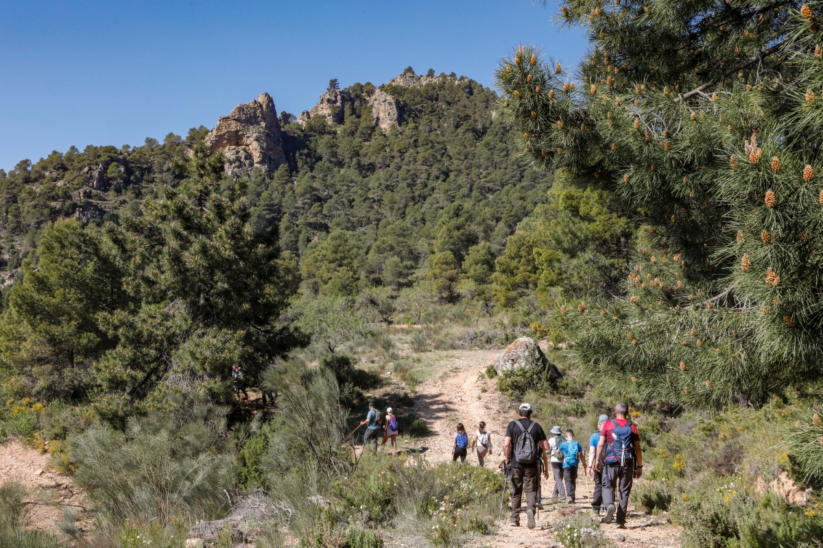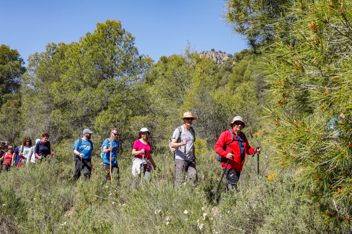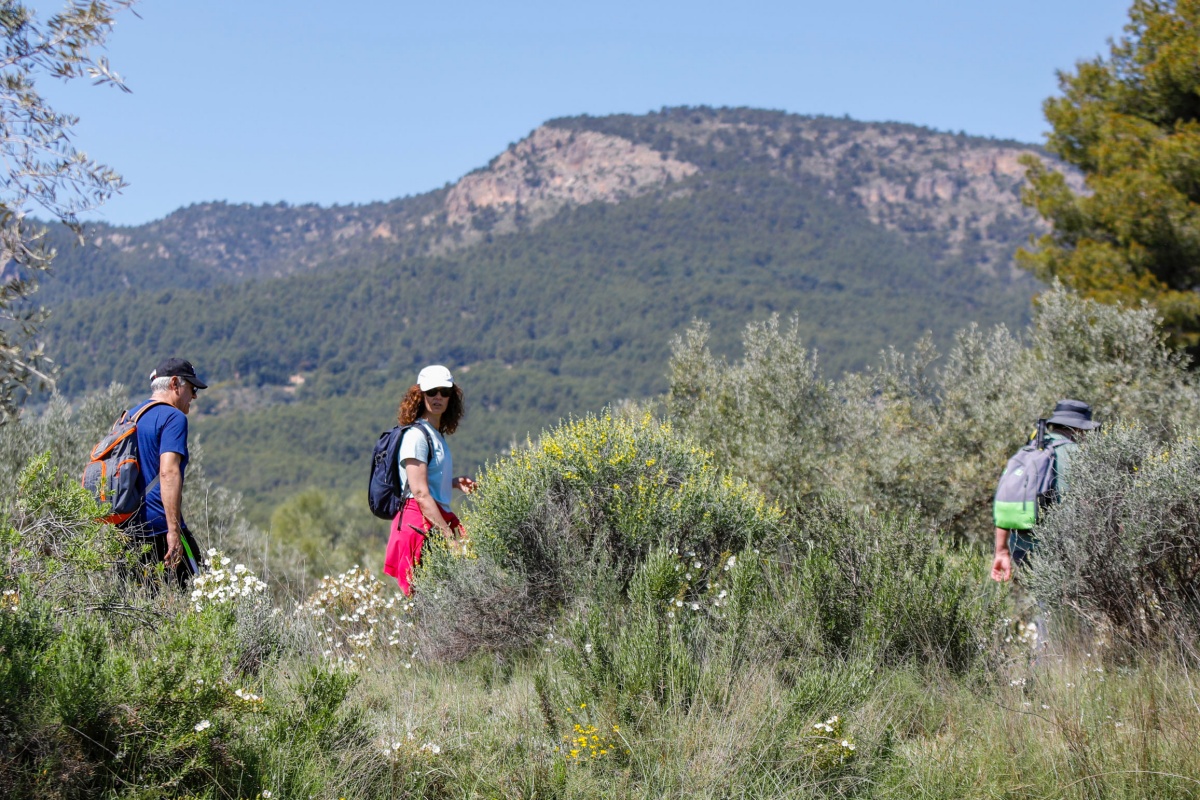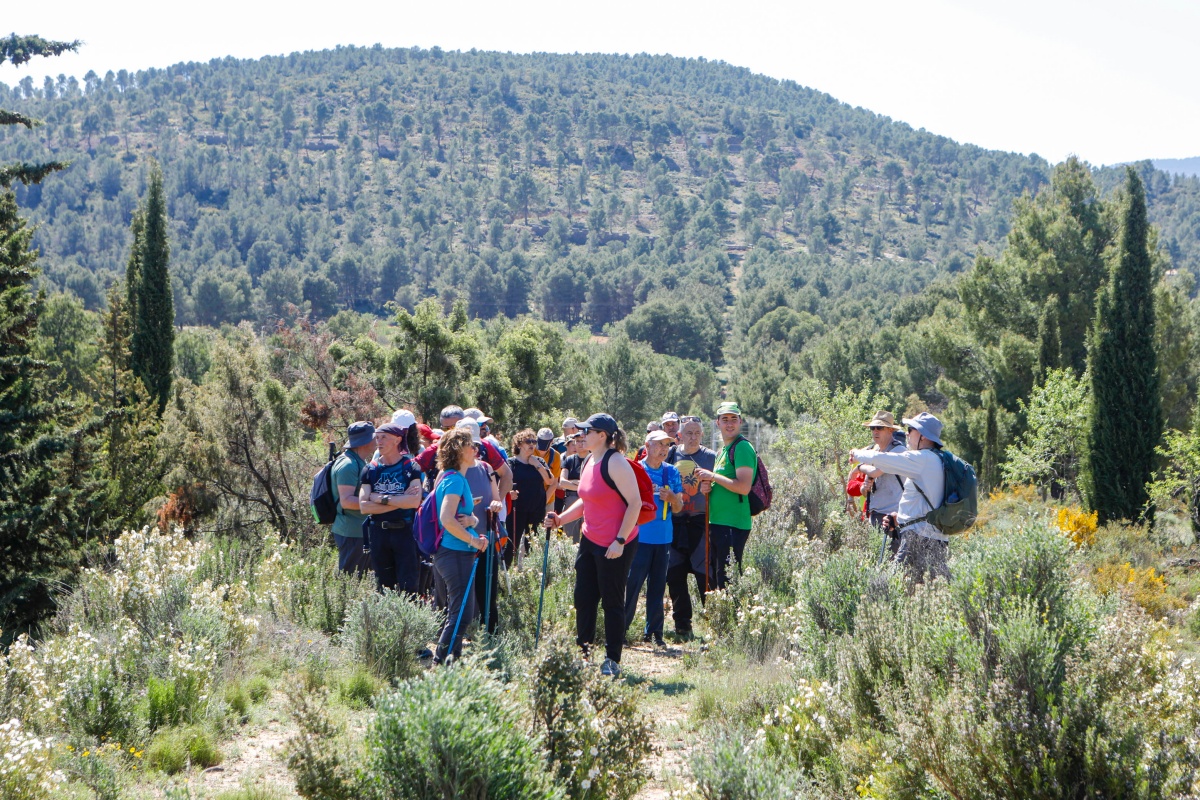 Comenzaron la marcha a pie por un pequeño tramo, por asfalto, rodeados de campos de cultivo, almendros y olivos principalmente, como un kilómetro, para luego desviarse a la derecha y tomar la senda del tigre, ya un entorno de monte mediterráneo, principalmente pino, romero, tomillo y aliagas ya en flor, donde habita la cabra montesa, junto a ciervos, corzos y rapaces como el Águila Real. Se adentrarían en un paraje declarado Reserva de la Biosfera por la UNESCO en 2019 y espacio de la Red Natura 2000.