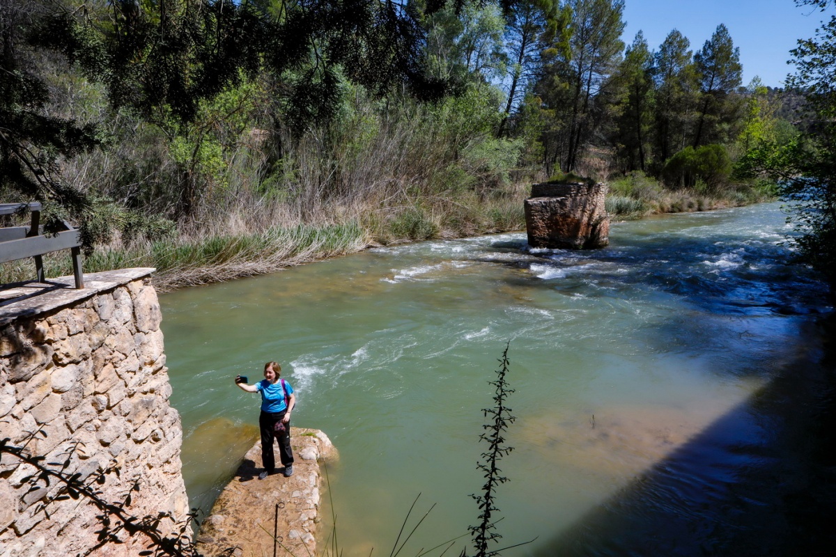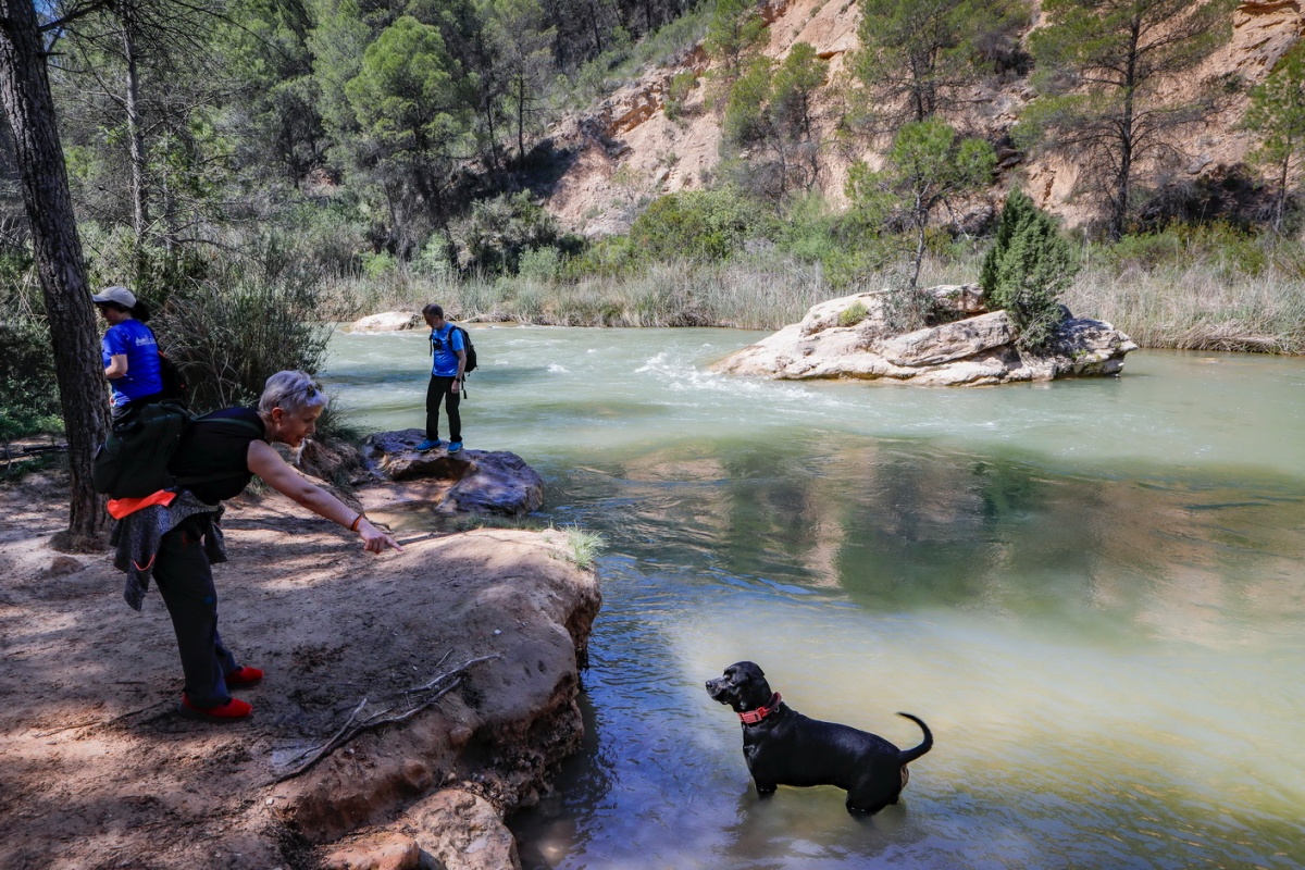 El sol empezaba a calentar, por lo que comenzaron el descenso, por pista, hacia la parte baja del valle, por donde surca el Río Cabriel, cuyas aguas son de las más limpias de Europa. Tras llegar a este, continuarían río arriba junto al cauce y pudieron contemplar, aparte de la gran cantidad de agua que llevaba, la extraordinaria actividad que se desarrolla en su interior, innumerables barcas, piraguas y kayak, navegaban por sus aguas.