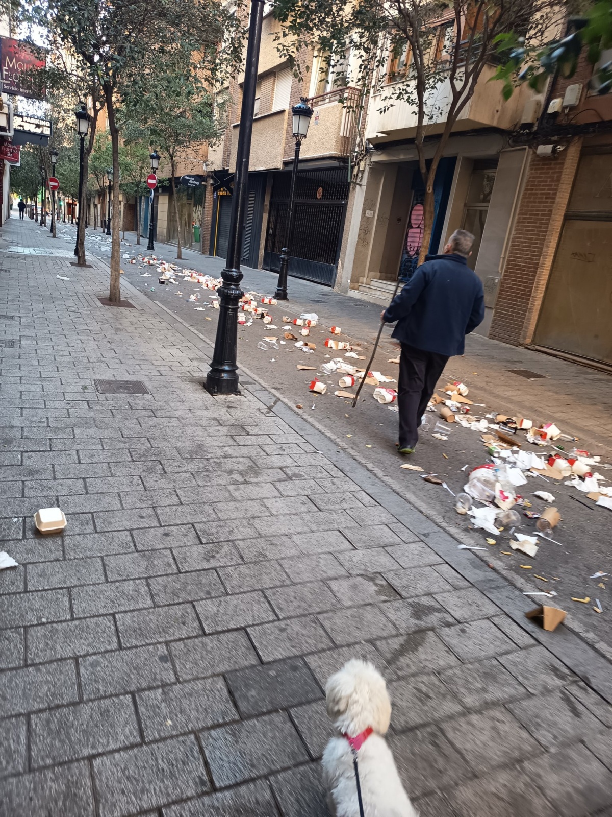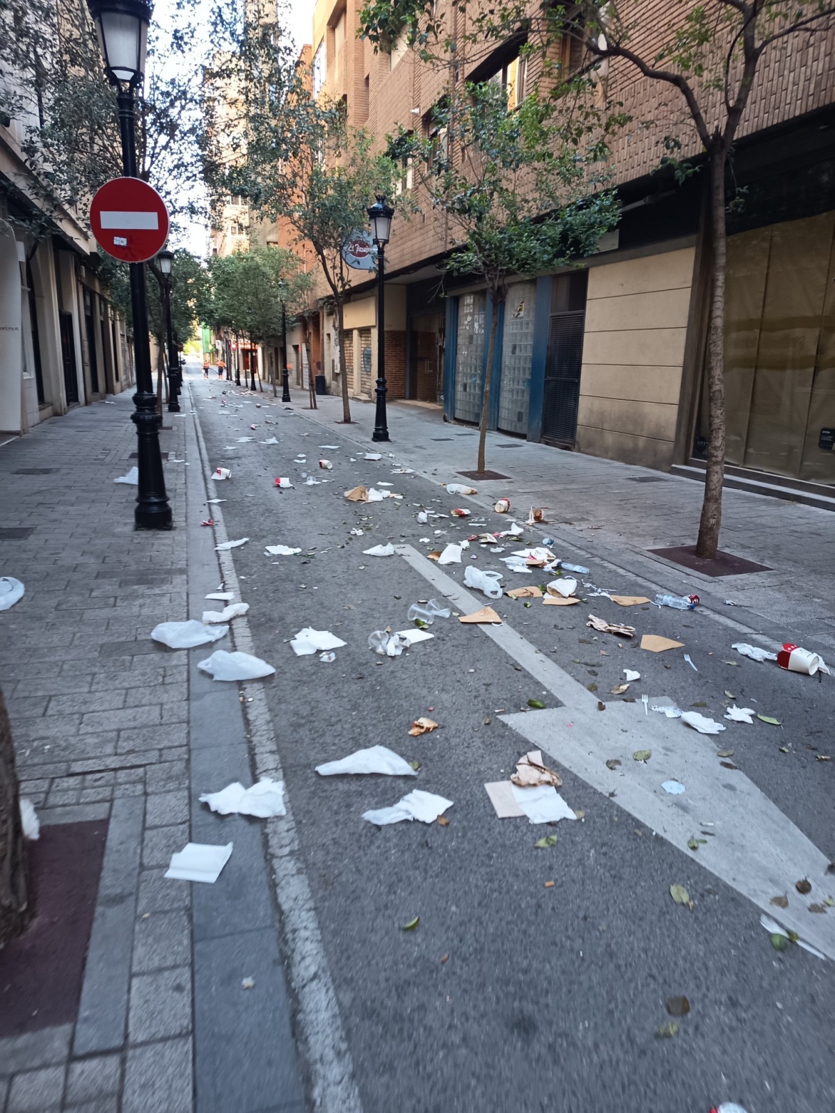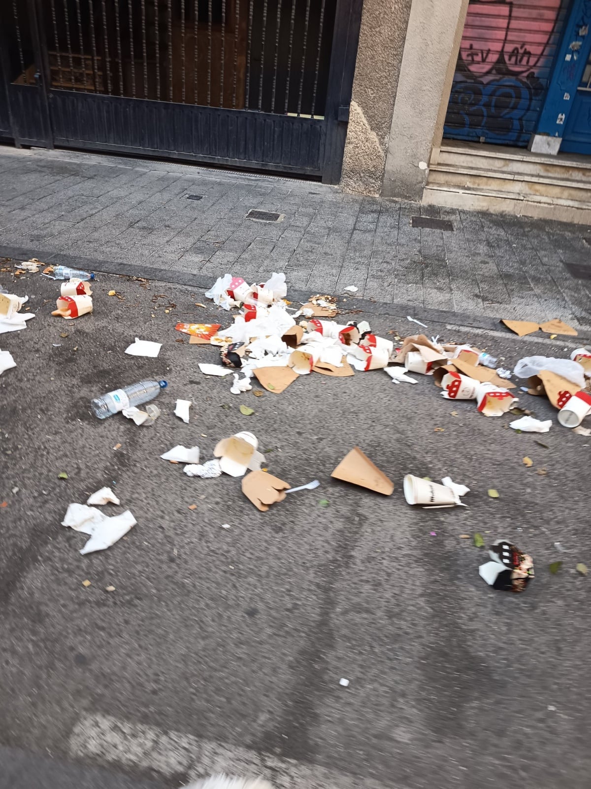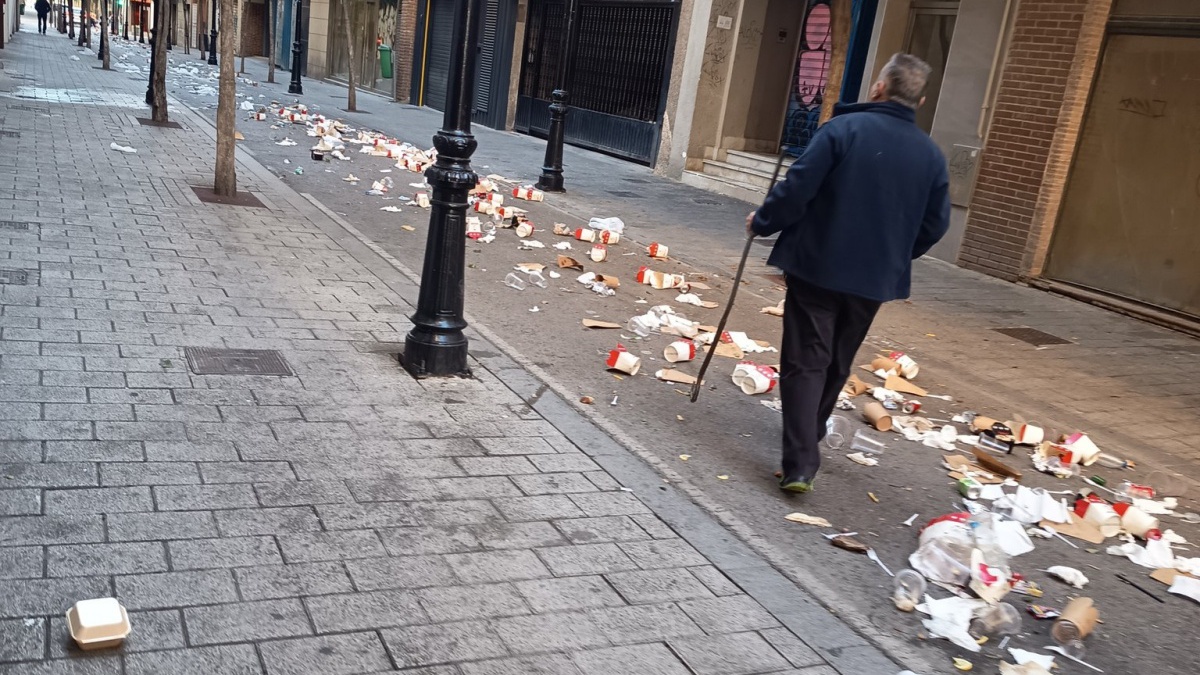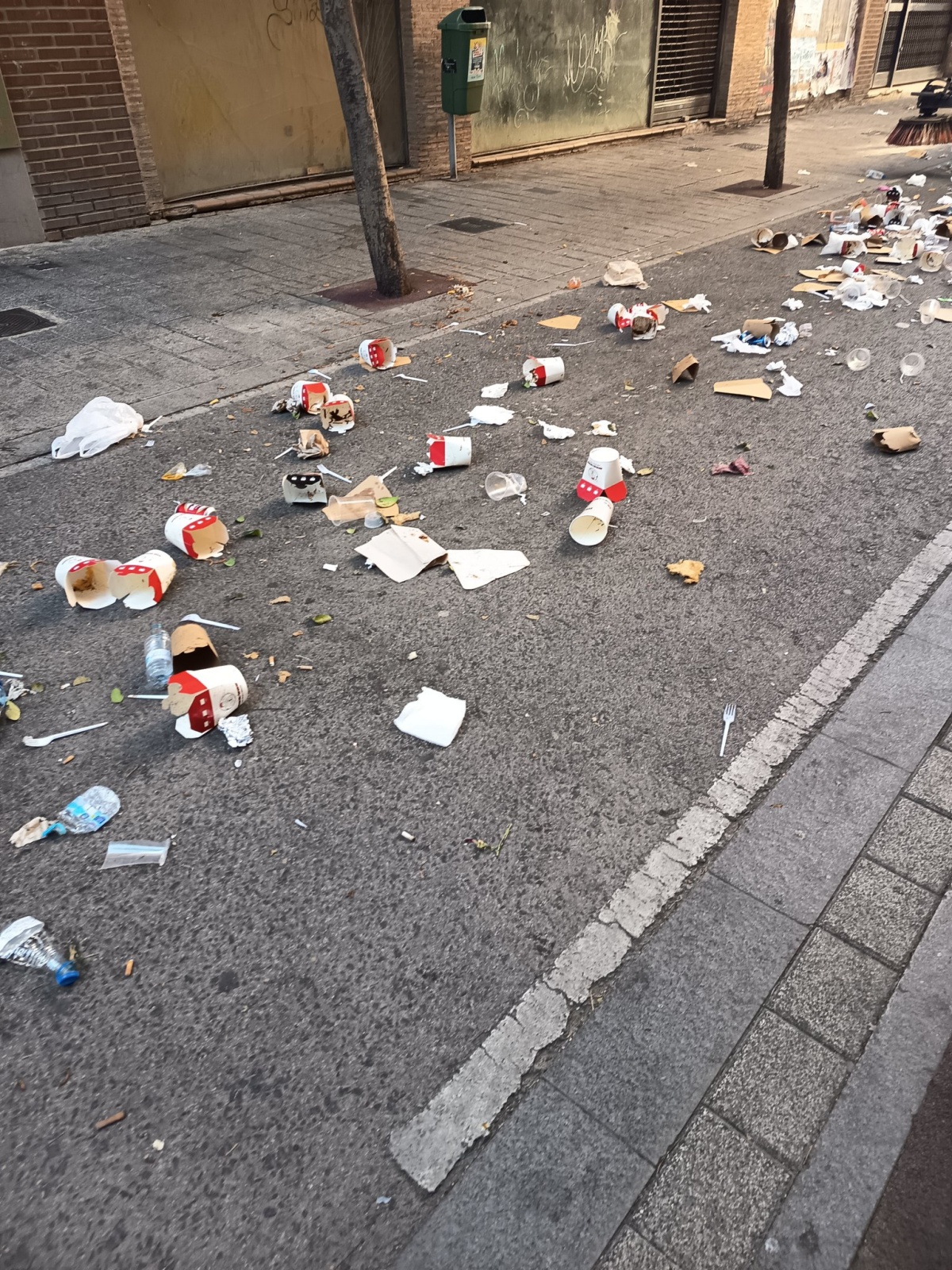 A primera hora de la mañana, sobre las 9:30, la imagen era muy distinta. La calle amanecía llena de basura, con vasos de plástico y cartón tirados por el suelo, restos de comida, servilletas, bolsas y botellas. Una escena que contrasta mucho con el buen ambiente de la tarde anterior.