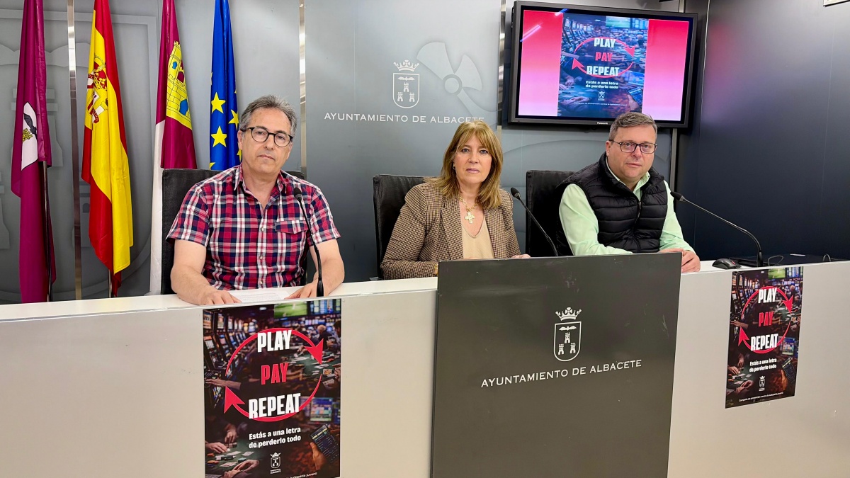 La concejala de Asuntos Sociales del Ayuntamiento de Albacete, Llanos Navarro, ha presentado en rueda de prensa la campaña de concienciación ‘Play, pay and repeat. Estás a una letra de perderlo todo’, junto al presidente de Aralba, Pedro Munera y el técnico municipal en drogodependencias José Cuadros.