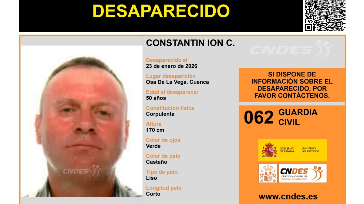 Constantin Ion C. es un hombre de 50 años cuyo rastro se perdió el pasado 23 de enero en la localidad conquense de Osa de la Vega. Su desaparición generó inquietud entre familiares, allegados y vecinos del municipio. Constantin Ion C. es un varón de constitución corpulenta, de aproximadamente 1,70 metros de altura, con ojos verdes y pelo castaño, corto y liso.
