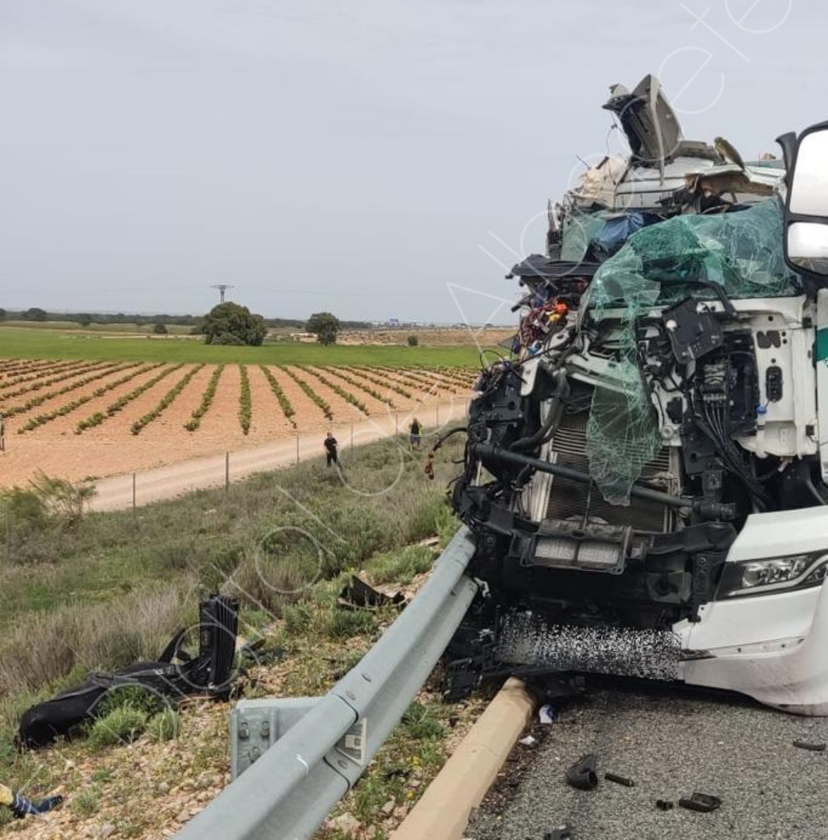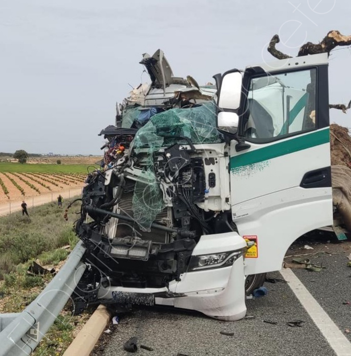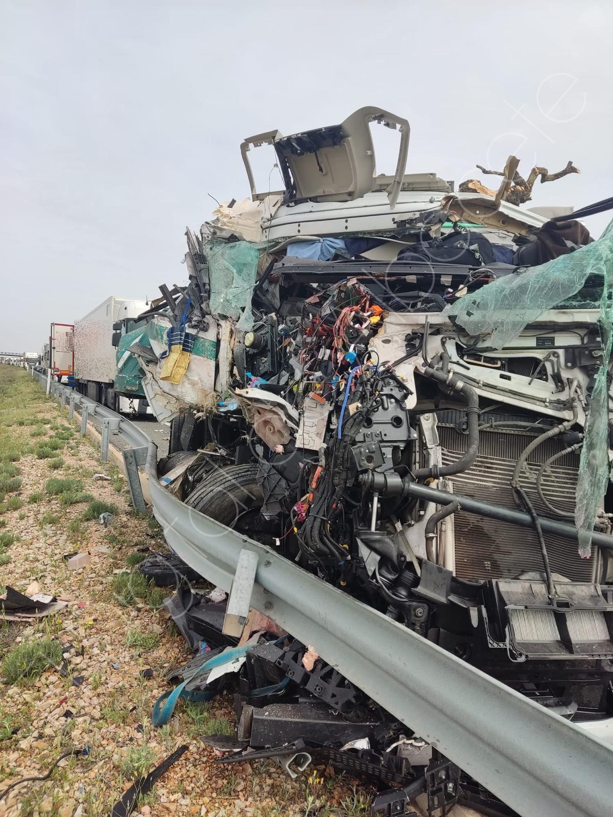 La colisión implicó a dos vehículos pesados y dejó una escena de gran dureza, como muestran las imágenes del accidente, con uno de los camiones prácticamente destrozado en su parte delantera y numerosos restos esparcidos sobre la calzada.