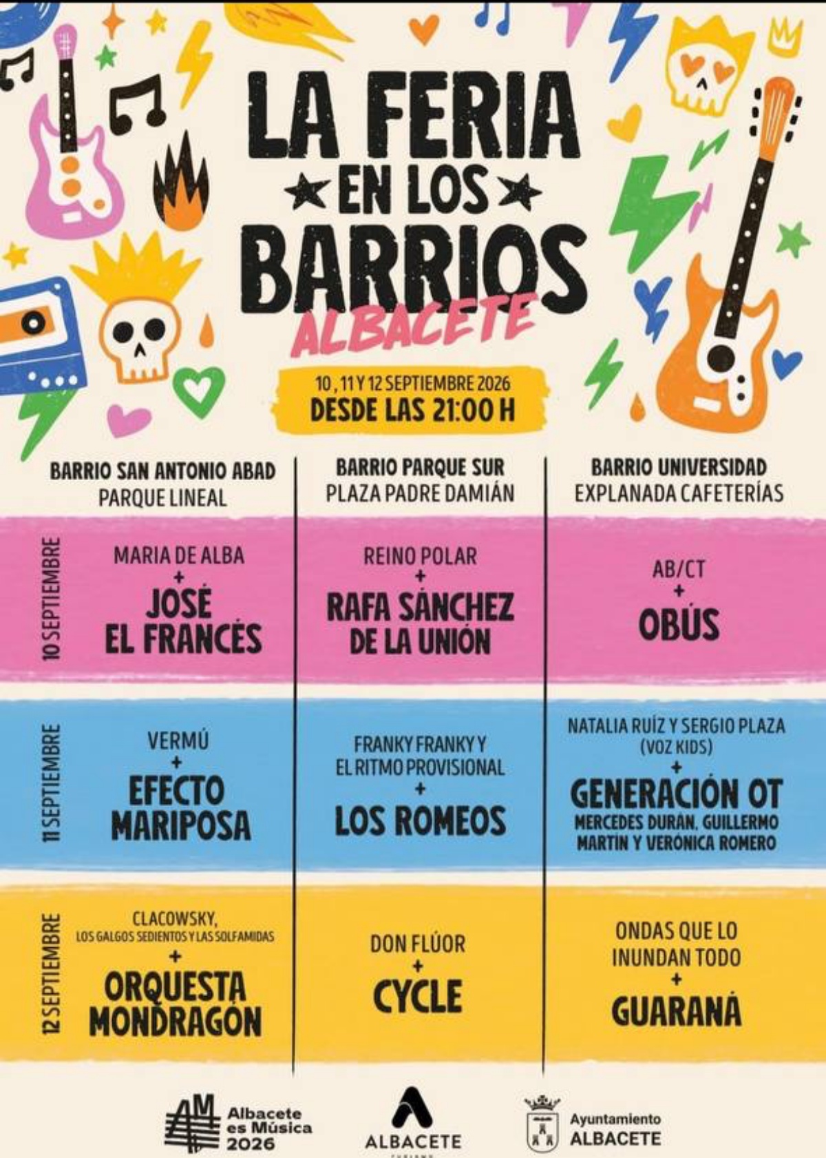 Así, la Feria en los Barrios toma múltiples rincones de Albacete para llenarlos de música y hacer disfrutar a los vecinos de la ciudad a las puertas de su casa. Para este 2026, la Feria en los Barrios se emplaza los días 10, 11 y 12 de septiembre, en el único fin de semana que presenta esta edición.
