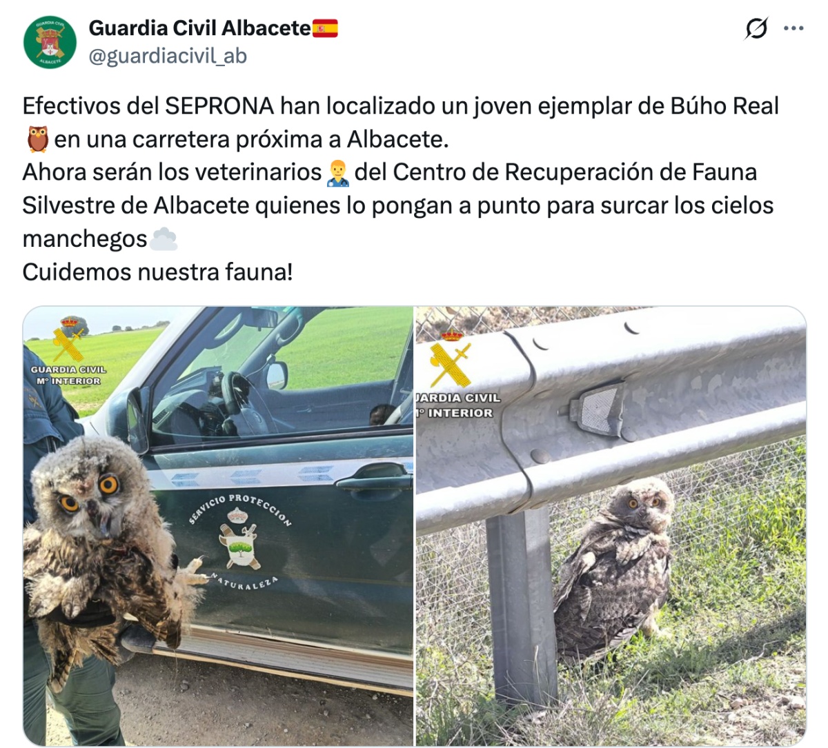 Así lo ha trasladado la Guardia Civil de Albacete a través de su perfil de X, (antes Twitter), y ha enviado un mensaje a la ciudadanía invitando a los vecinos de Albacete para “cuidar de nuestra fauna”. Una vez en el centro, el ejemplar de búho real quedó bajo la supervisión de veterinarios especializados, que están evaluando su estado de salud y aplicando los cuidados necesarios para su recuperación.