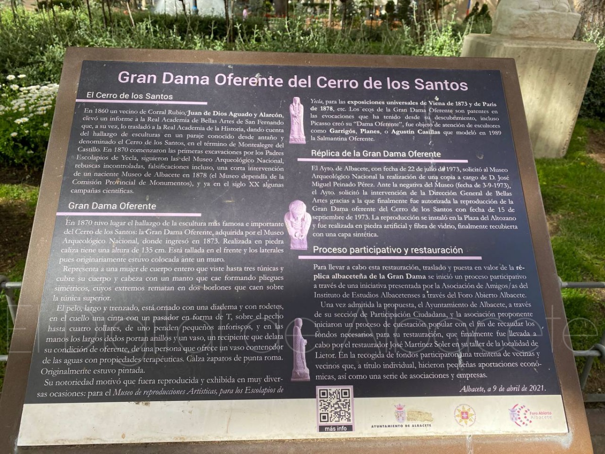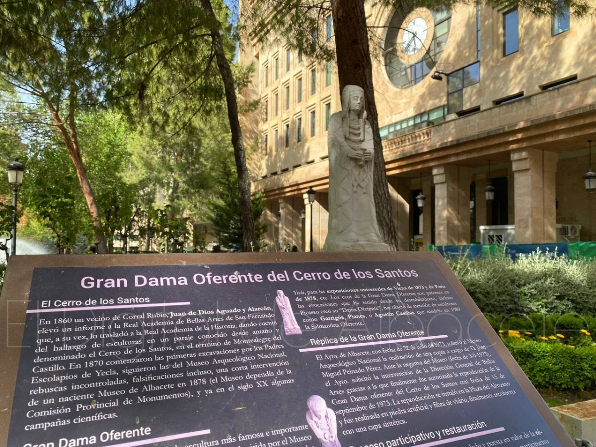 El lugar comenzó excavaciones en 1870, y luego tomó el relevo el Museo Arqueológico Nacional y un joven Museo de Albacete, convirtiendo al Cerro de los Santos en lugar de peregrinaje para arqueólogos. Entre todas las piezas únicas que volvieron a aparecer entre los restos de un incendio, apareció una muy especial: la Gran Dama Oferente, una escultura femenina de una mujer ataviada portando un vaso que ofrece la divinidad entre sus manos.