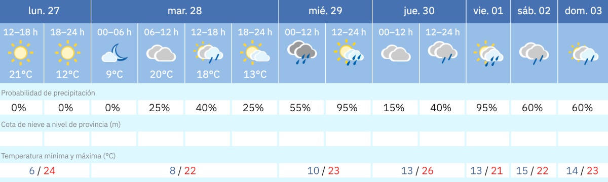 En conjunto, la provincia afronta varios días de tiempo muy cambiante, con un inicio cálido con calima y un giro brusco hacia un escenario de tormentas frecuentes, algunas de ellas localmente intensas, en plena recta final de abril.