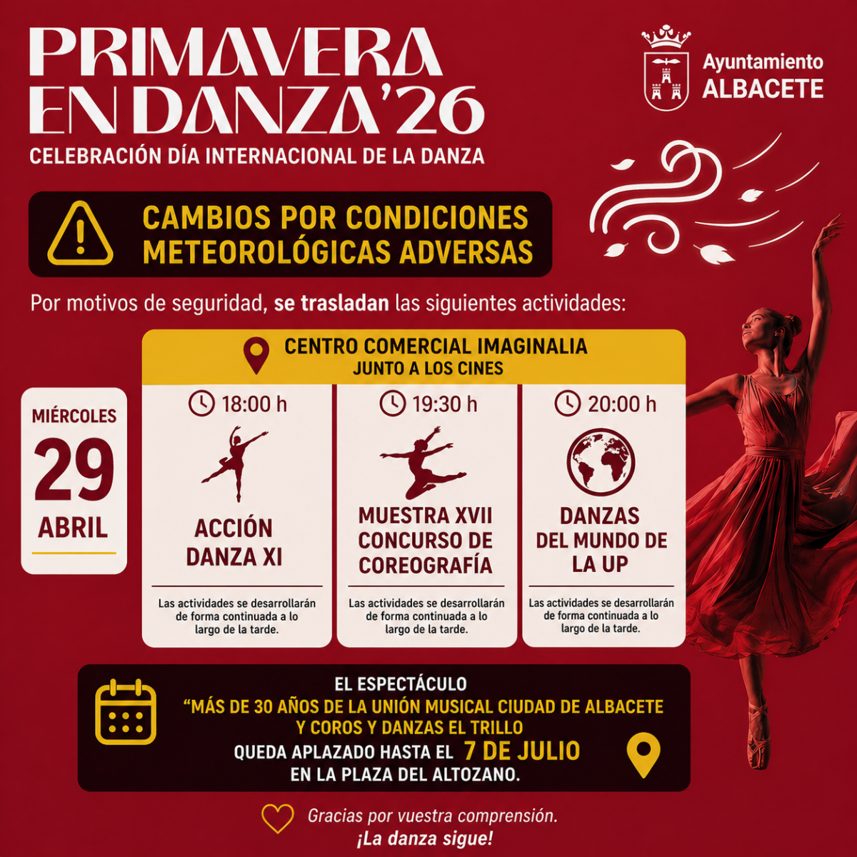 El Ayuntamiento de Albacete agradece la comprensión de la ciudadanía ante estos cambios y anima a seguir disfrutando de la programación cultural con motivo del Día Internacional de la Danza, agradeciendo expresamente al equipo directivo y profesional del Centro Comercial Imaginalia por su disposición, colaboración y rapidez a la hora de facilitar un espacio alternativo para la celebración de estas actividades.