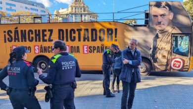 Multan a este autobús rotulado con una imagen de Pedro Sánchez que emula a Hitler